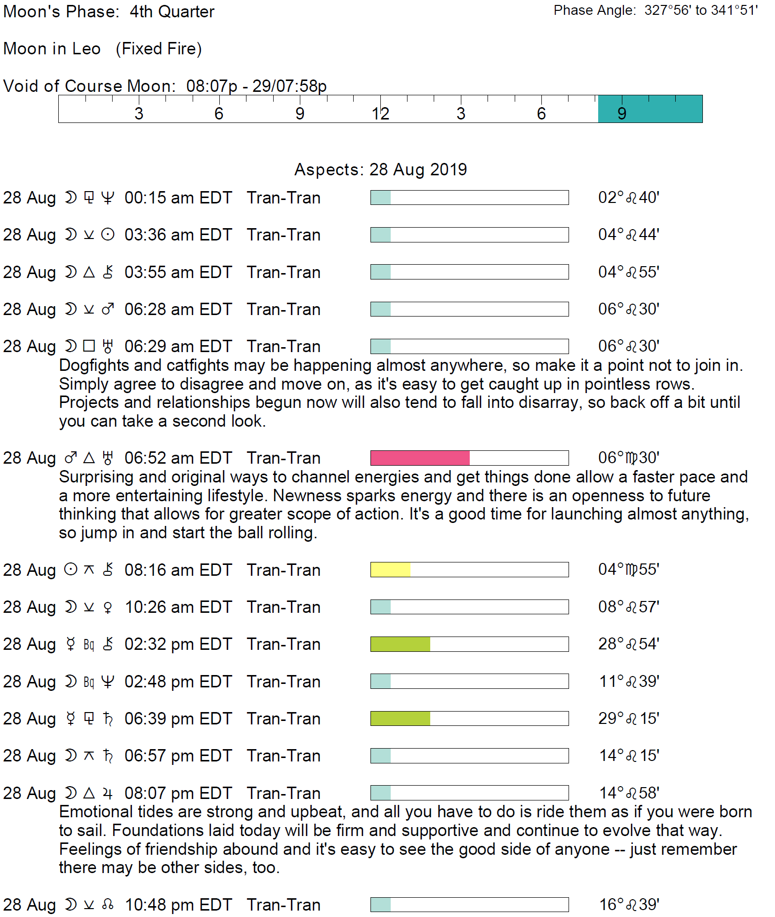 Planet Color Key: The longer the bar, the slower the aspecting planet and the longer the duration of the planet’s transit.