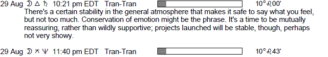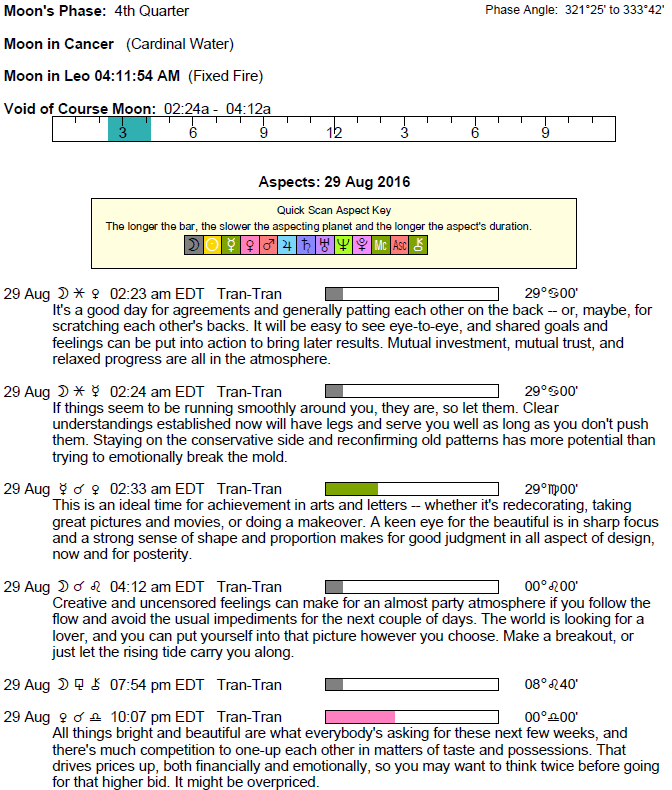 - The Moon is in Leo from 4:11 AM forward (until Wednesday, August 31st, at 11:21 AM).