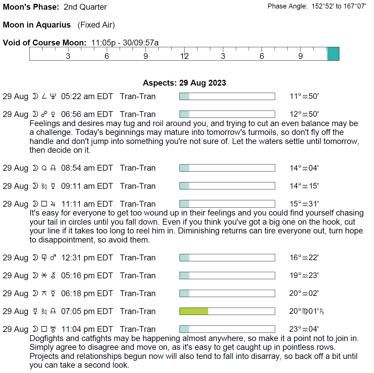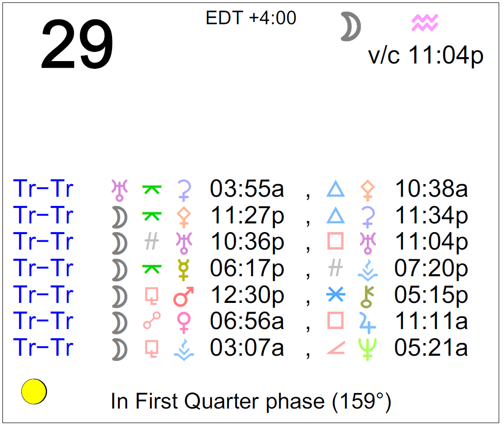 - A void Moon period occurs from 11:04 PM forward (until the Moon enters Pisces tomorrow).