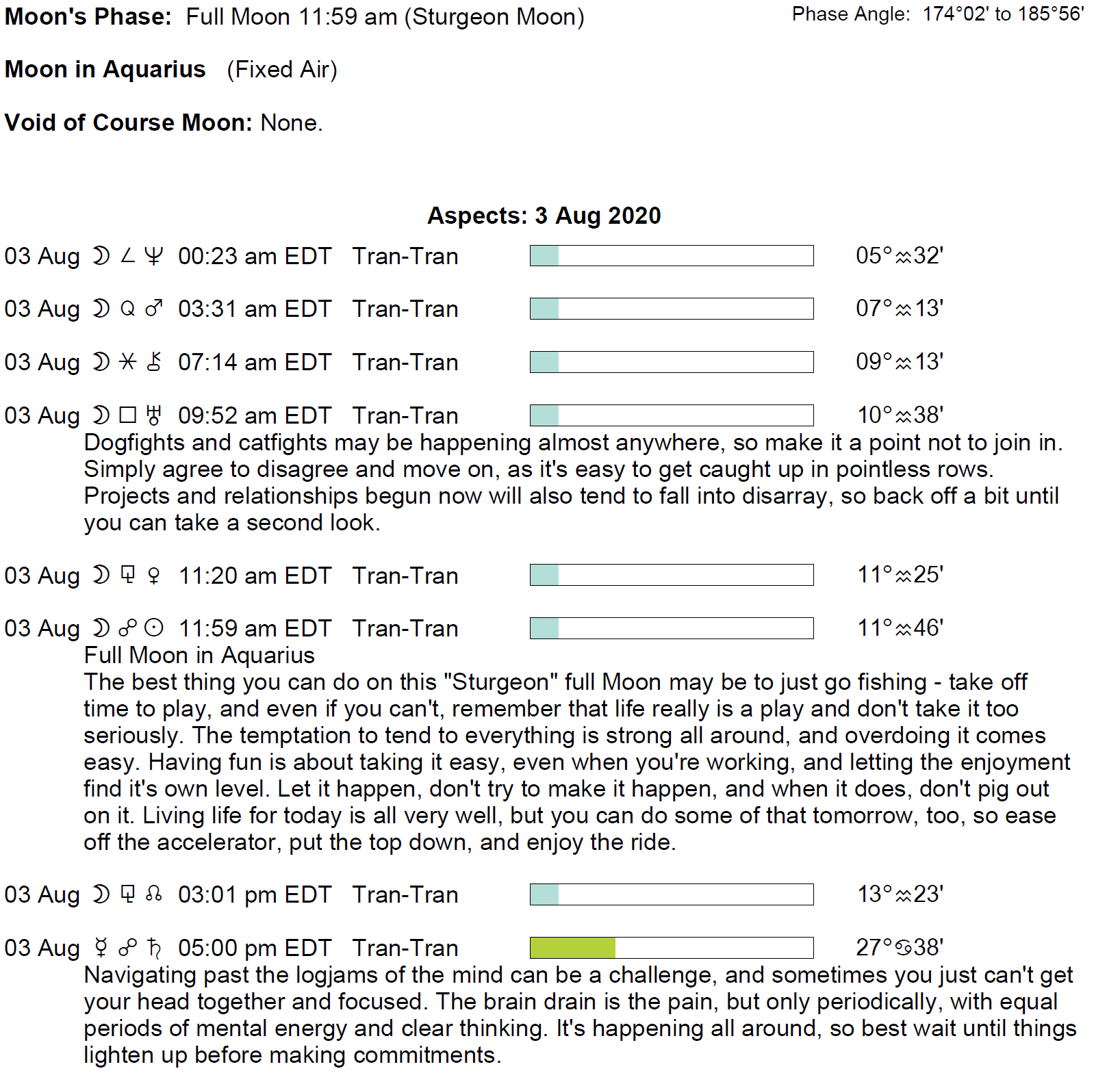 Planet Color Key: The longer the bar, the slower the aspecting planet and the longer the duration of the planet’s transit.