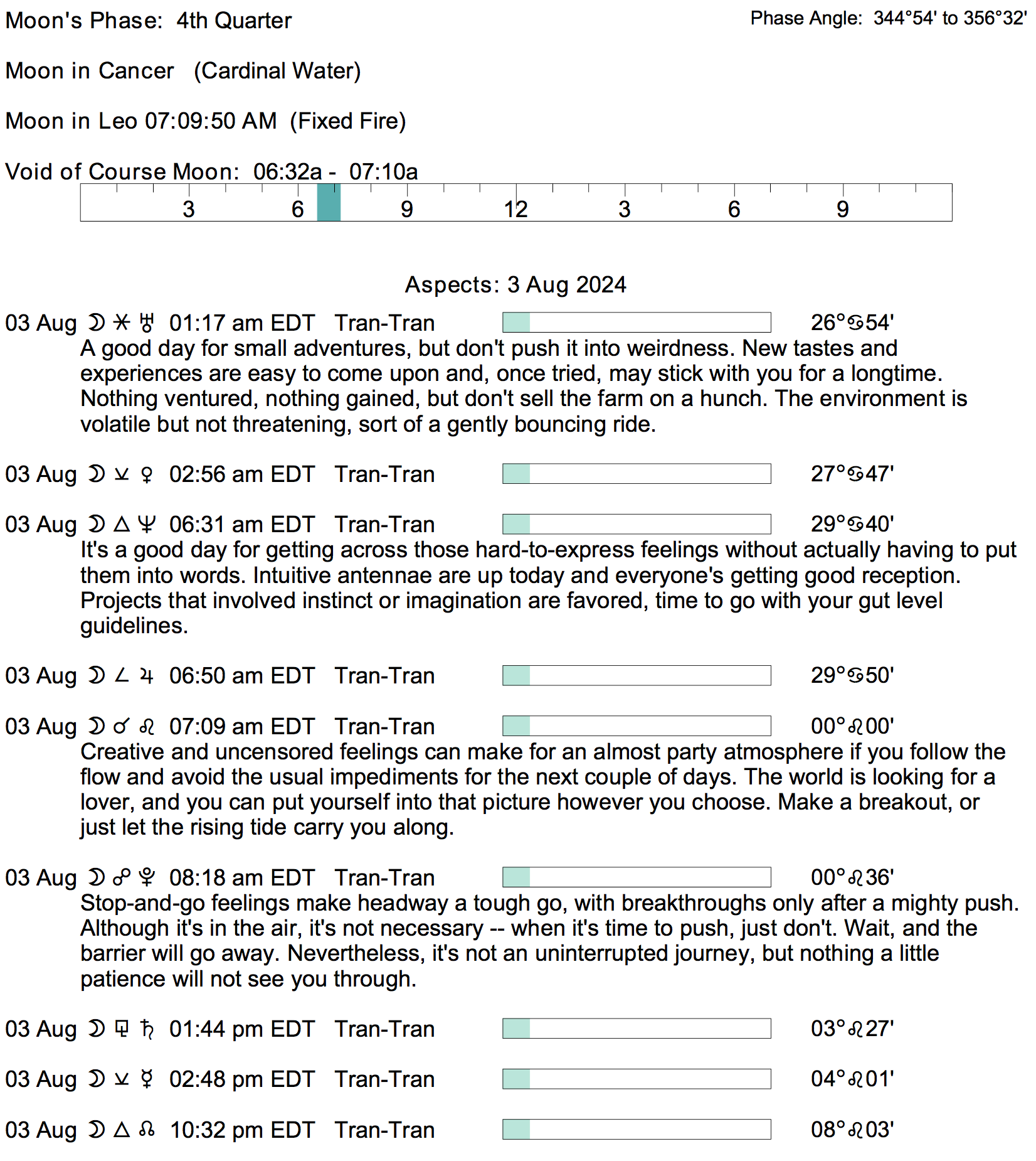 Planet Color Key: The longer the bar, the slower the aspecting planet, and the longer the duration of the planet’s transit.