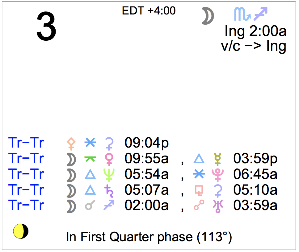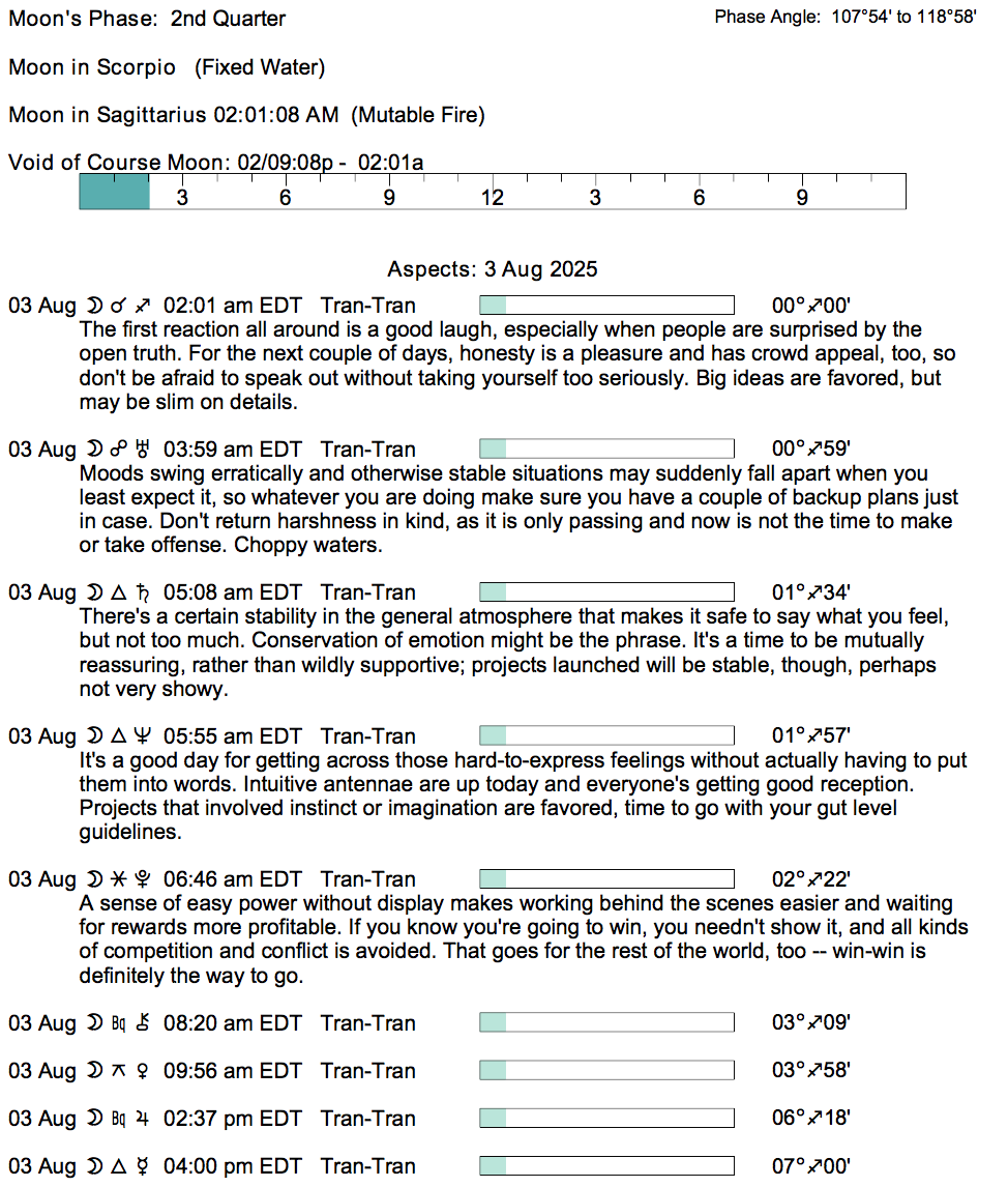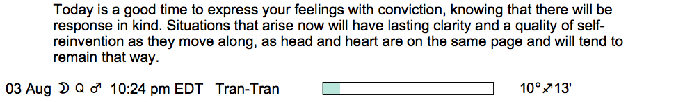 Planet Color Key: The longer the bar, the slower the aspecting planet, and the longer the duration of the planet’s transit.