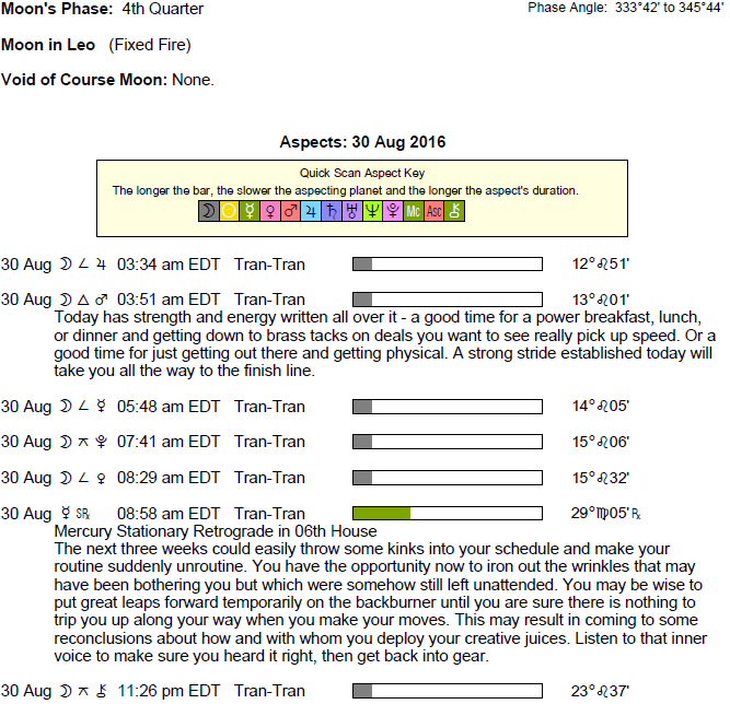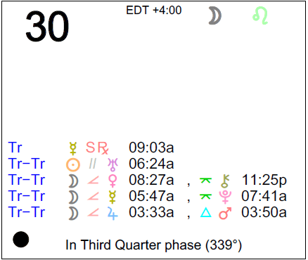 The following aspects (major only) and positions are at noon (EDT) on August 30th: