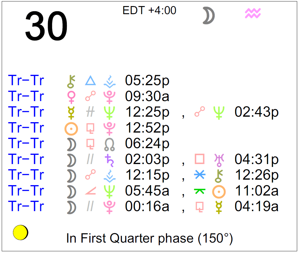 Planet Color Key: The longer the bar, the slower the aspecting planet and the longer the duration of the planet’s transit.