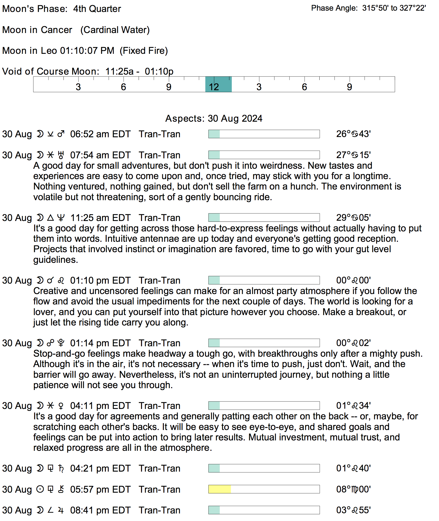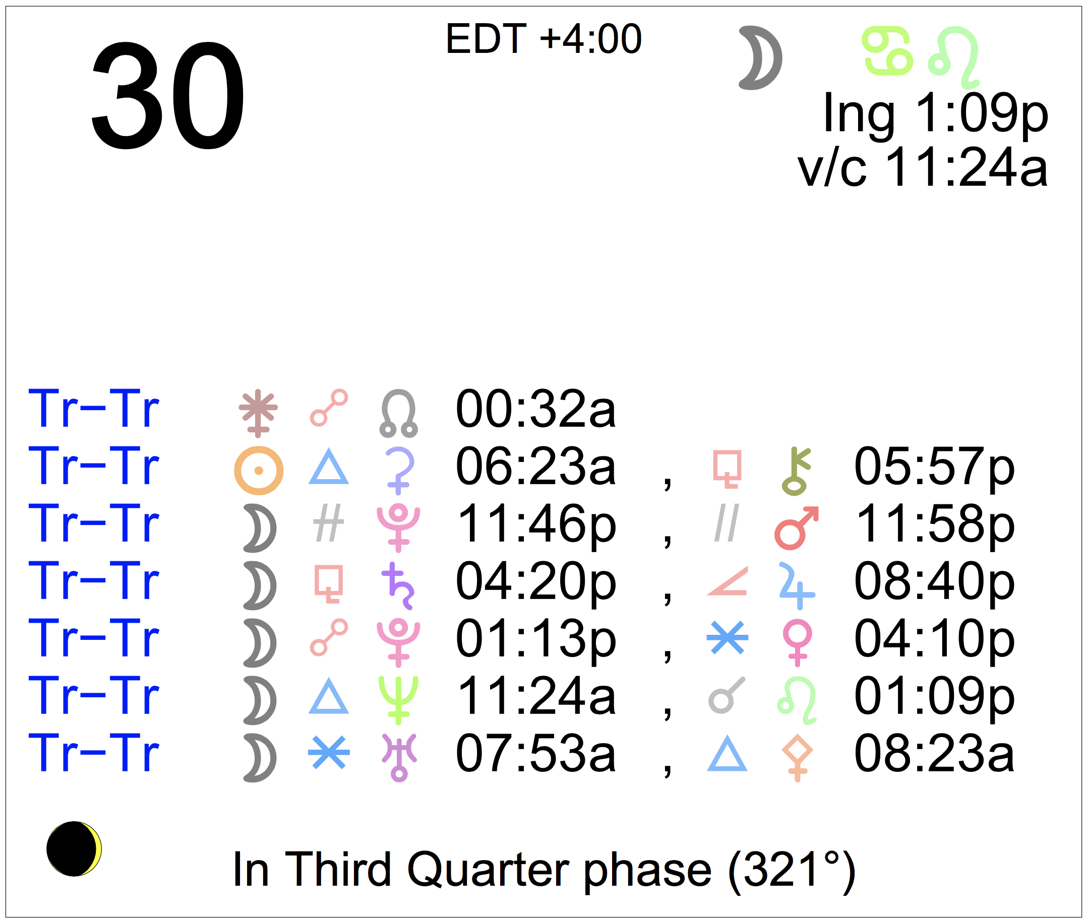 Planet Color Key: The longer the bar, the slower the aspecting planet, and the longer the duration of the planet’s transit.