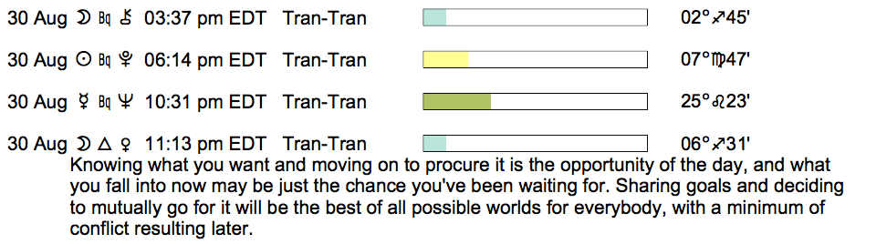 Planet Color Key: The longer the bar, the slower the aspecting planet, and the longer the duration of the planet’s transit.
