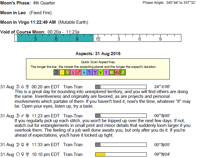 - The Moon is in Virgo from 11:21 AM forward (until Friday, September 2nd, at 8:55 PM).
