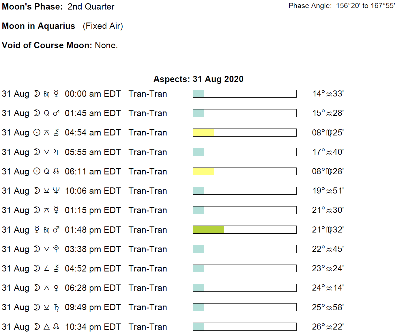 Planet Color Key: The longer the bar, the slower the aspecting planet and the longer the duration of the planet’s transit.