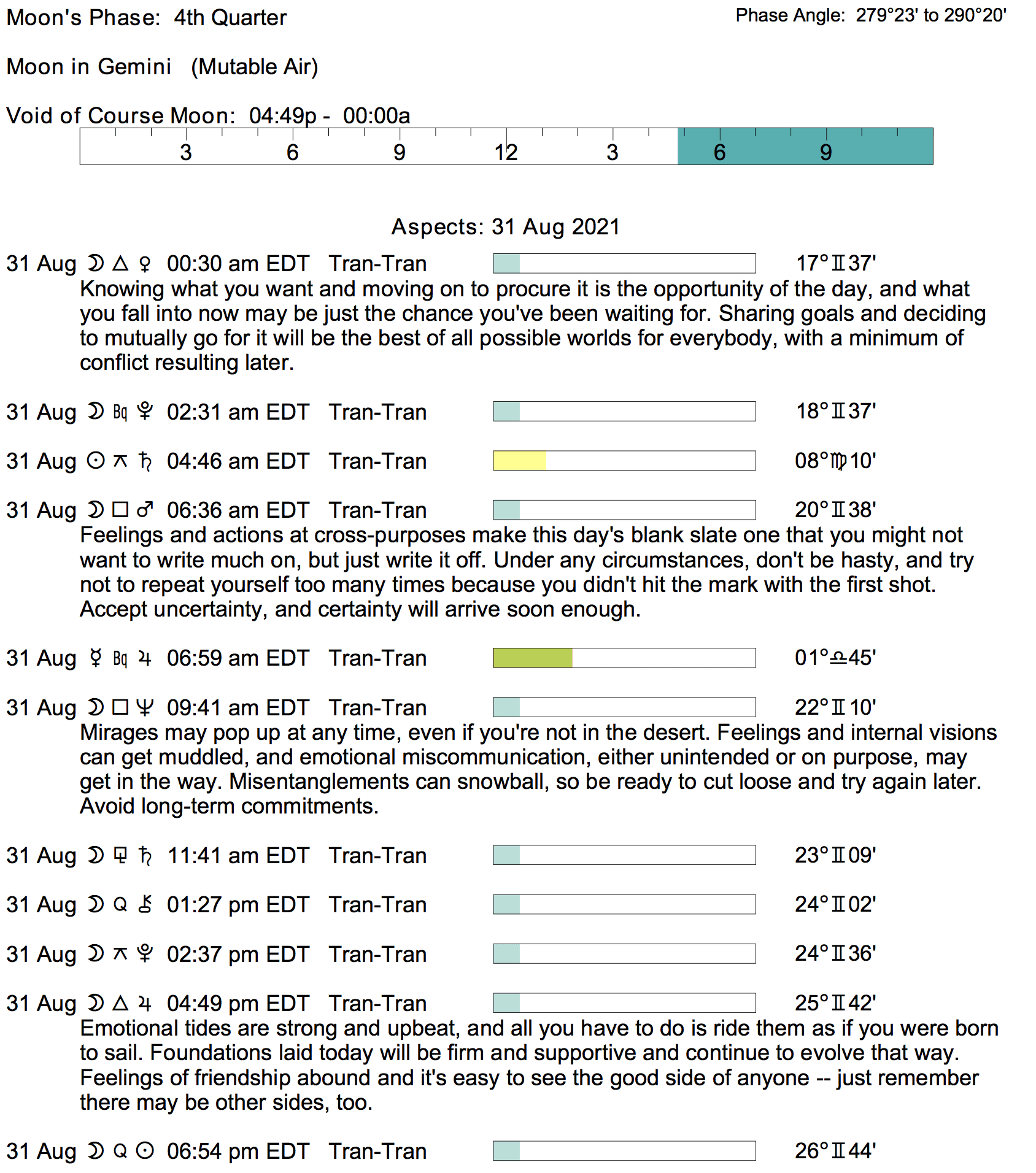 Planet Color Key: The longer the bar, the slower the aspecting planet, and the longer the duration of the planet’s transit.