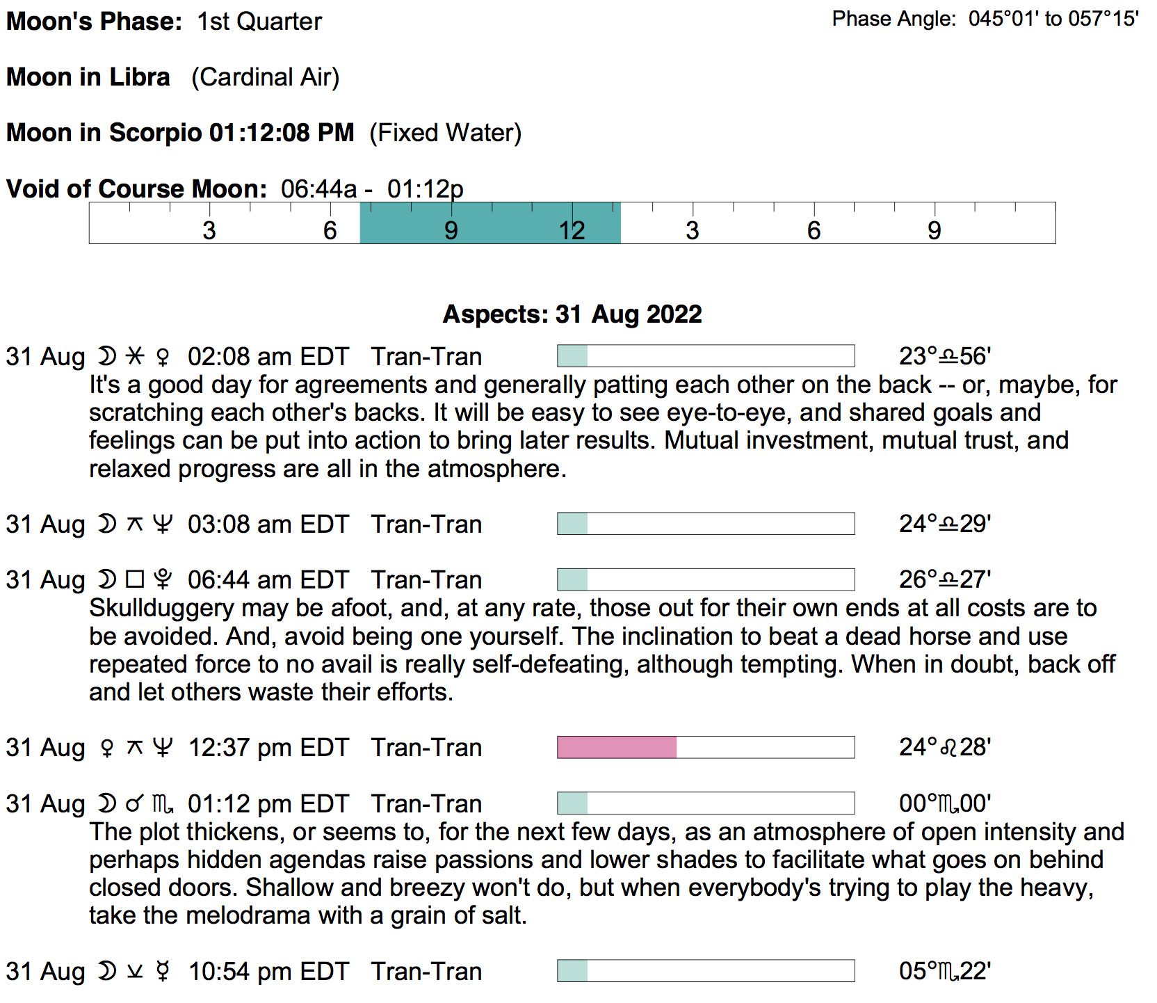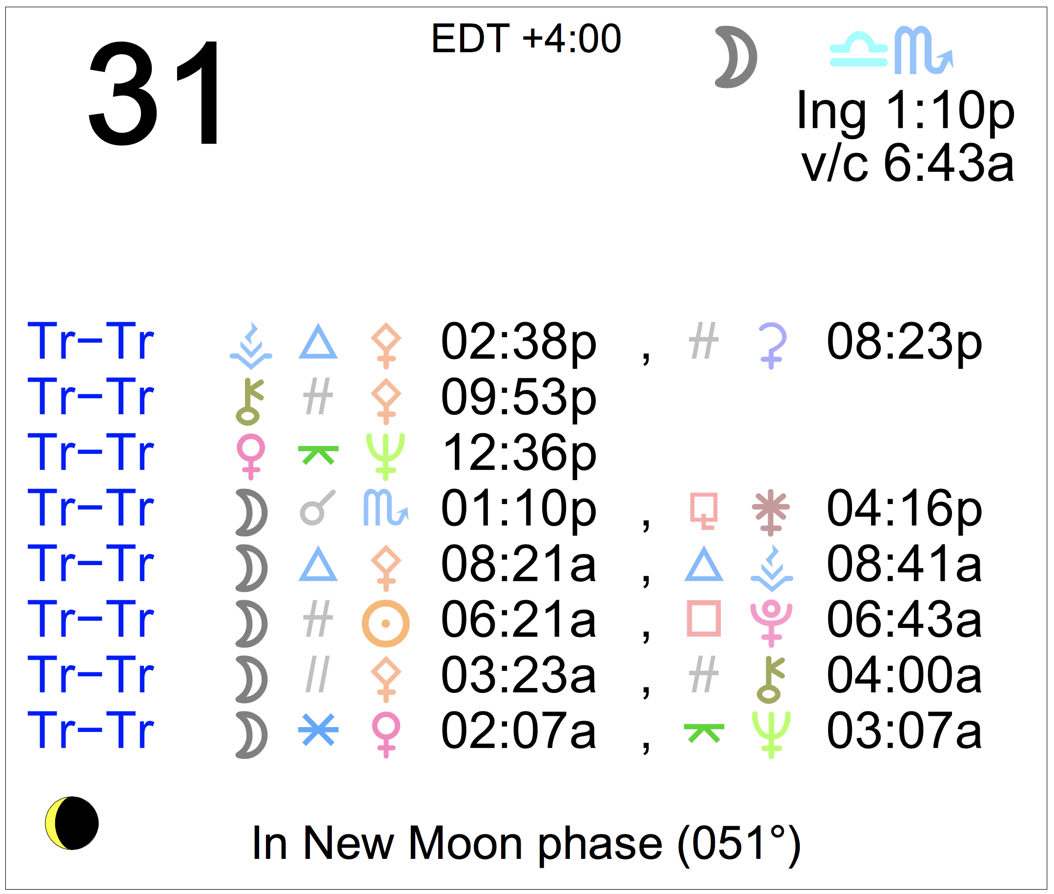 Planet Color Key: The longer the bar, the slower the aspecting planet, and the longer the duration of the planet’s transit.