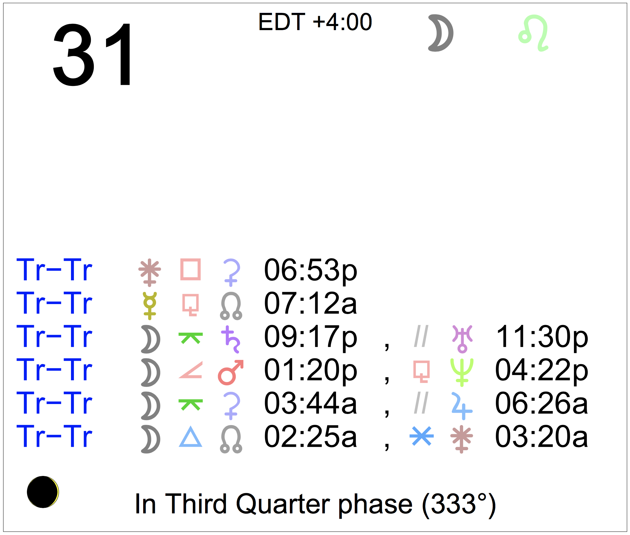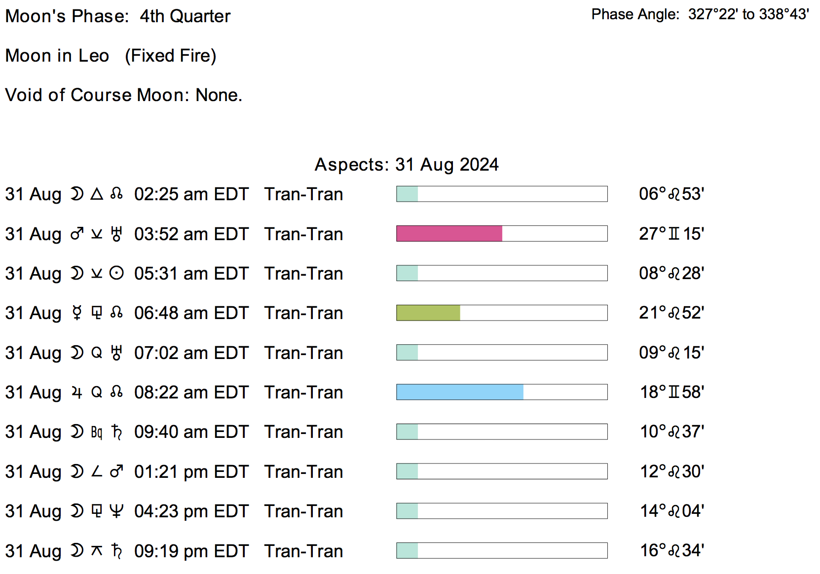 Planet Color Key: The longer the bar, the slower the aspecting planet, and the longer the duration of the planet’s transit.