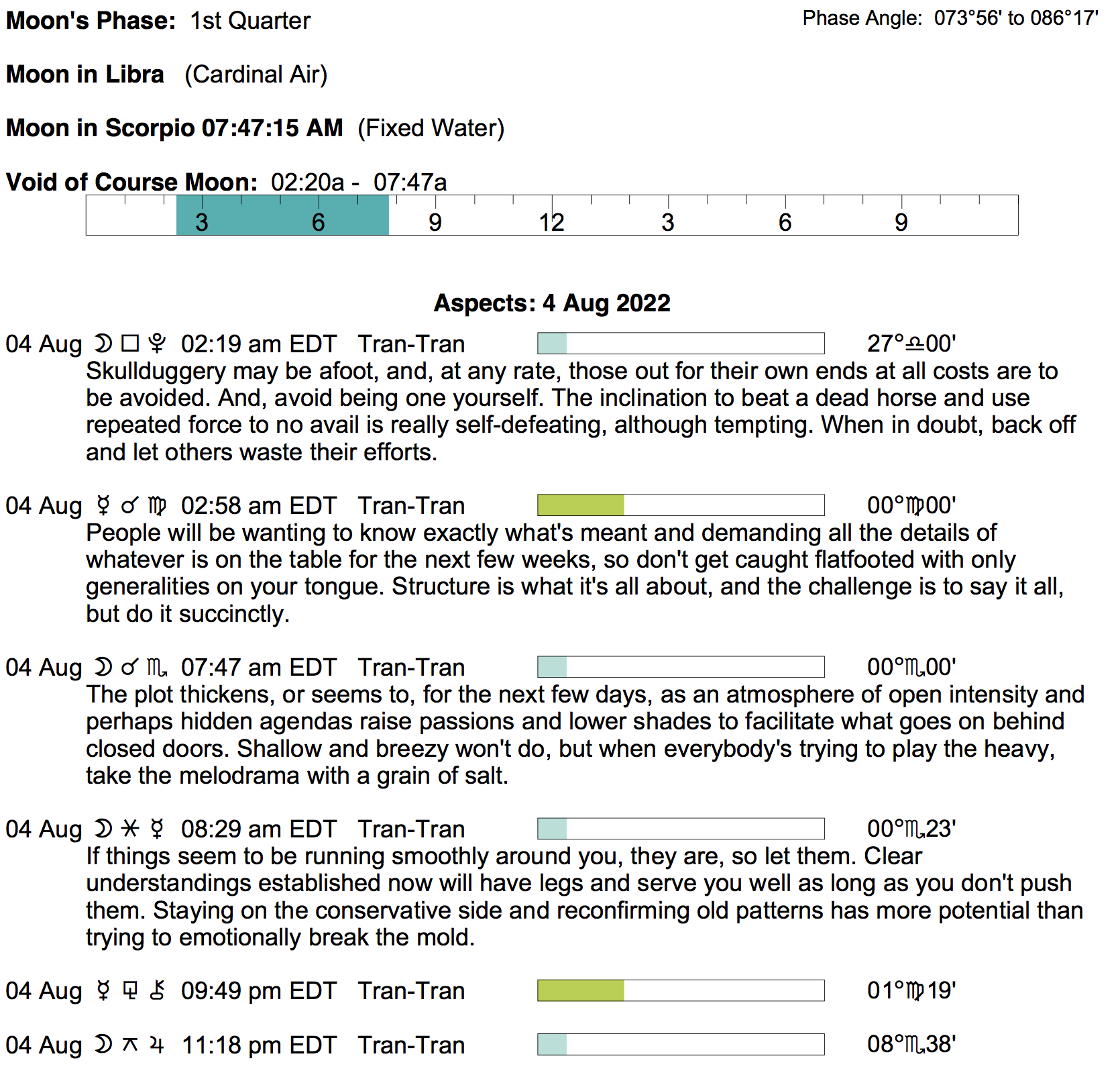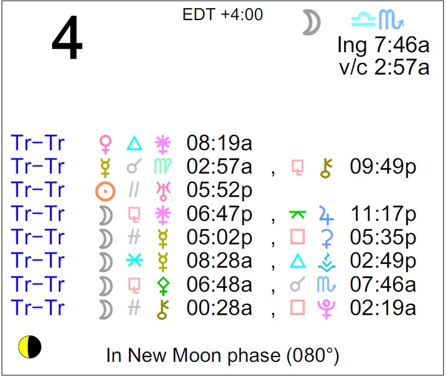 Planet Color Key: The longer the bar, the slower the aspecting planet, and the longer the duration of the planet’s transit.