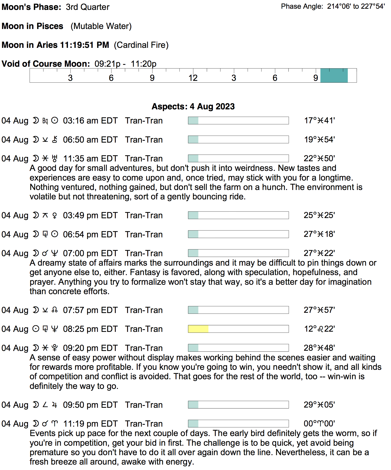 Planet Color Key: The longer the bar, the slower the aspecting planet, and the longer the duration of the planet’s transit.