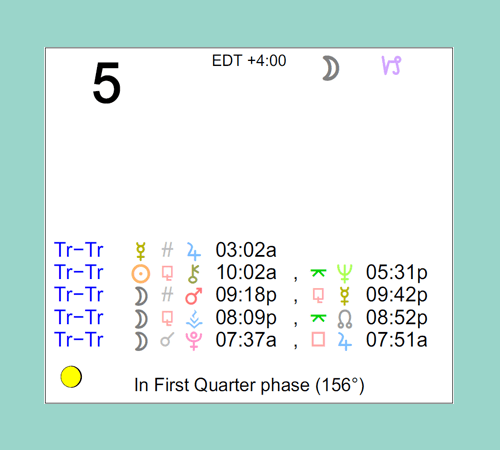 The following aspects (major only) and positions are at noon (EDT) on August 5th: