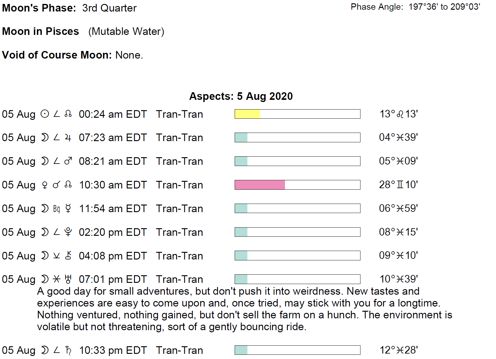 Planet Color Key: The longer the bar, the slower the aspecting planet and the longer the duration of the planet’s transit.