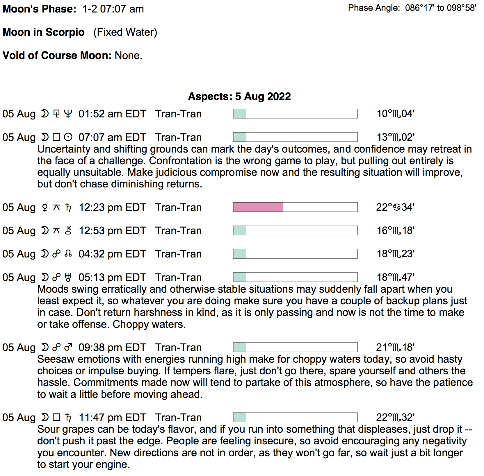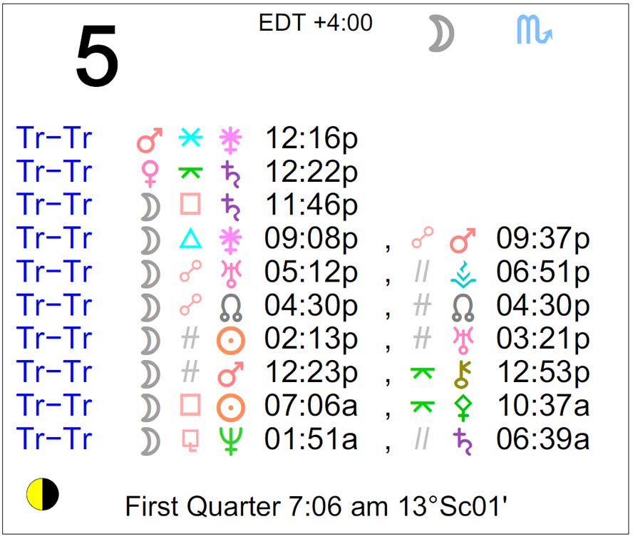 Planet Color Key: The longer the bar, the slower the aspecting planet, and the longer the duration of the planet’s transit.