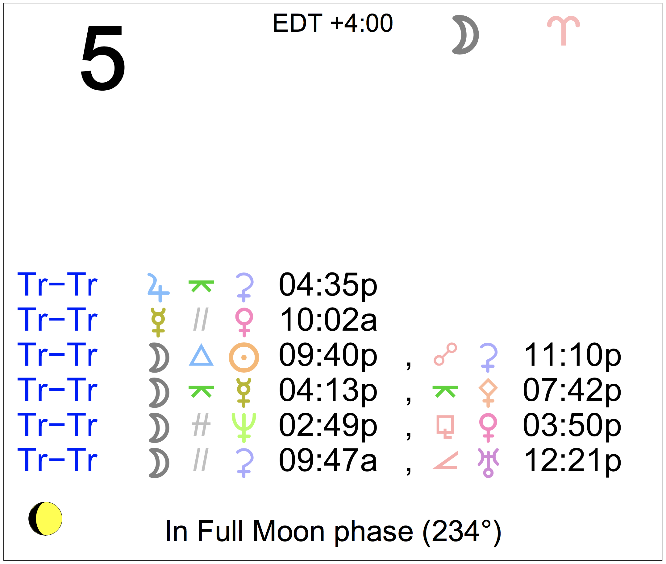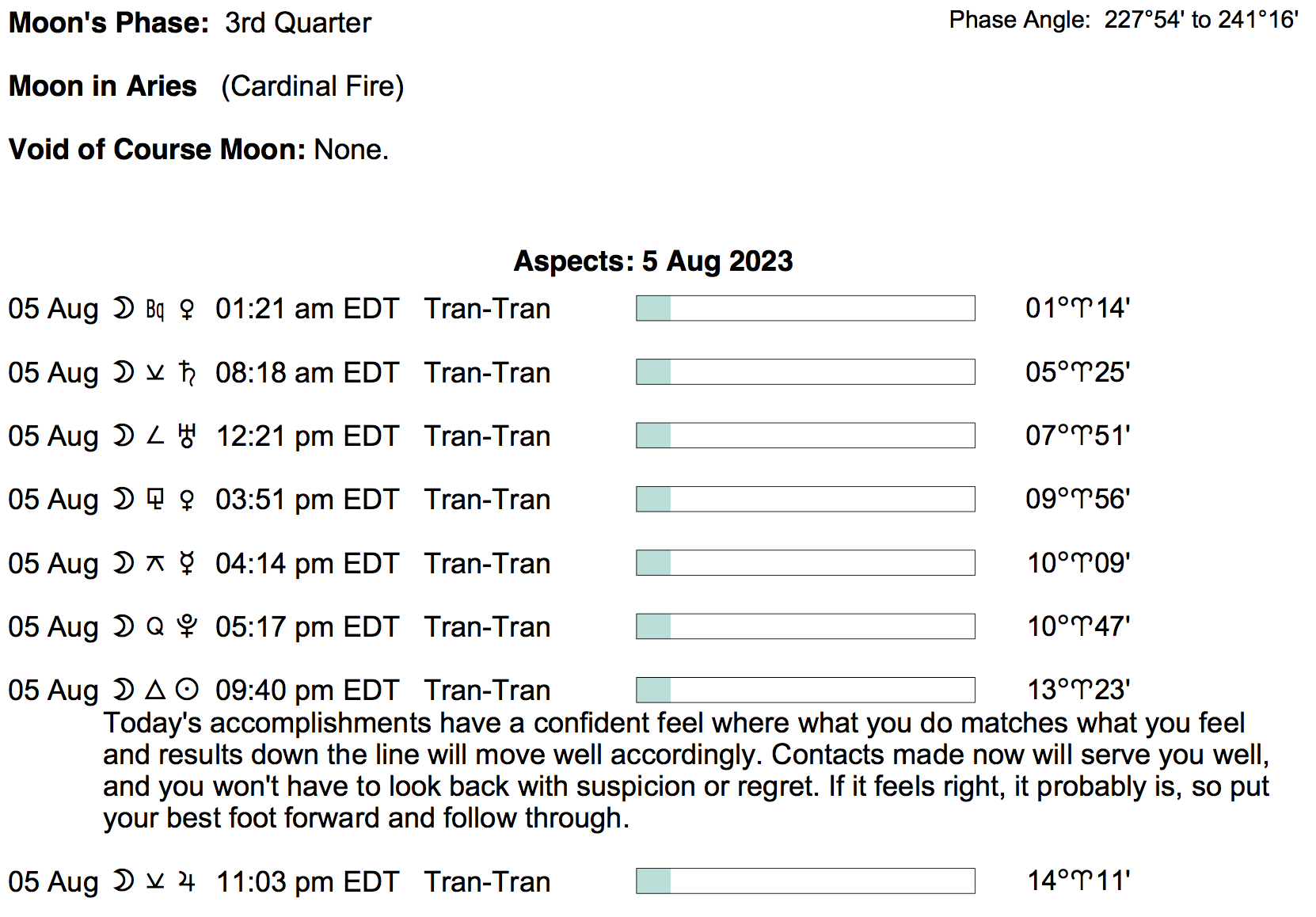 Planet Color Key: The longer the bar, the slower the aspecting planet, and the longer the duration of the planet’s transit.