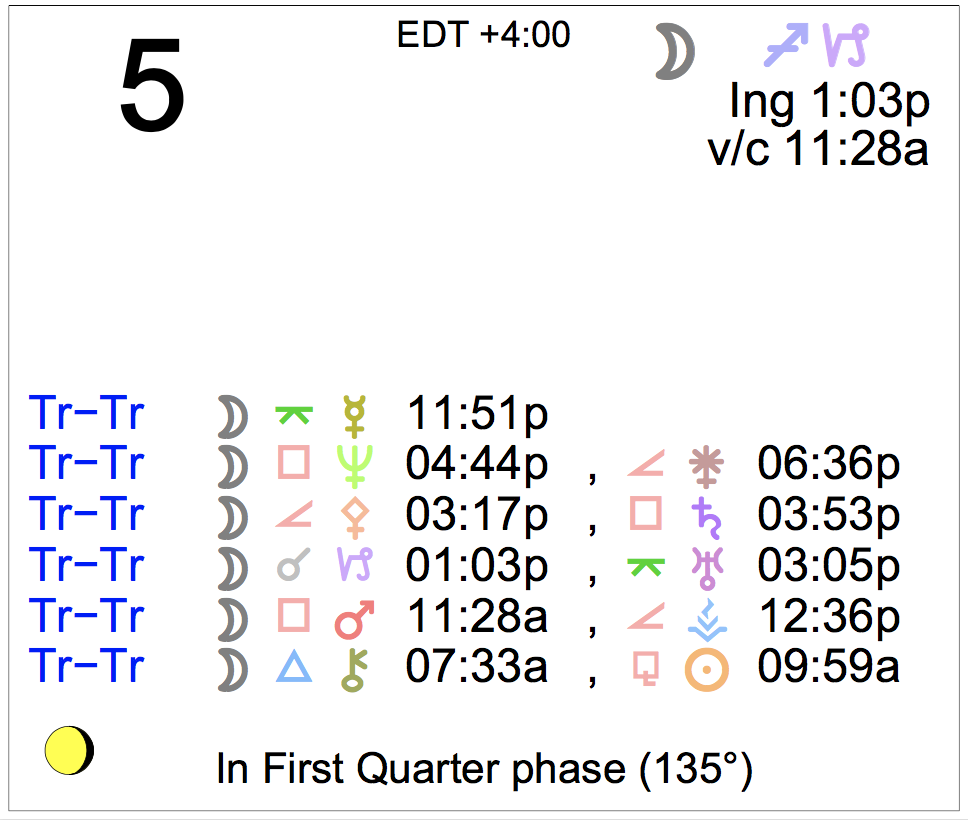 Planet Color Key: The longer the bar, the slower the aspecting planet, and the longer the duration of the planet’s transit.