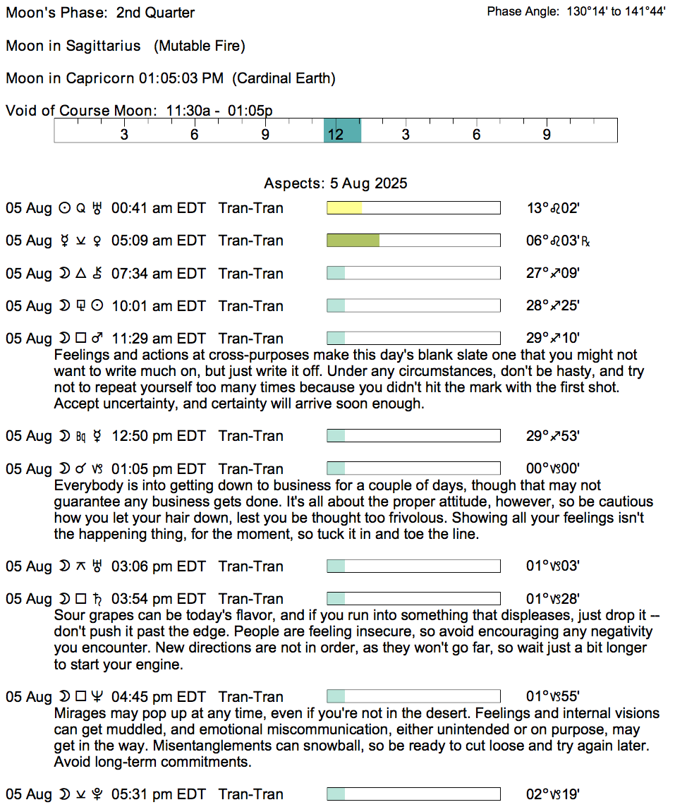 - A void Moon period occurs from 11:28 AM to 1:03 PM today.
