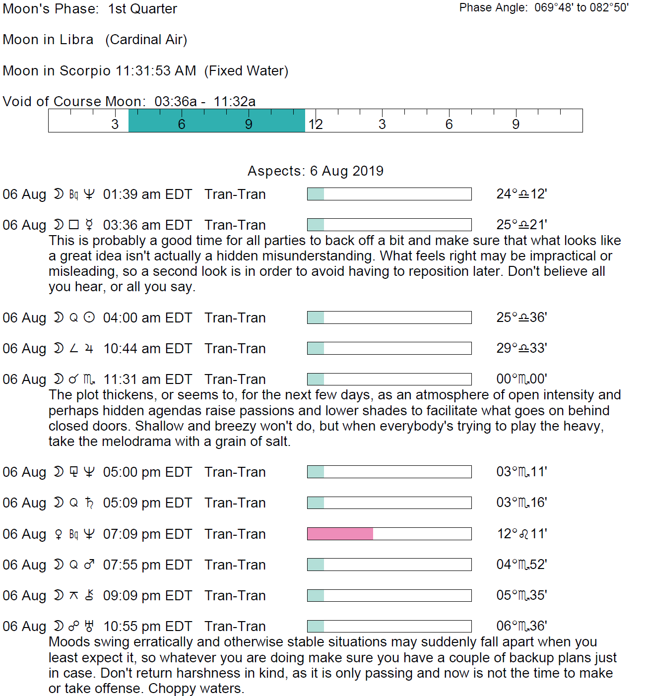 Planet Color Key: The longer the bar, the slower the aspecting planet and the longer the duration of the planet’s transit.