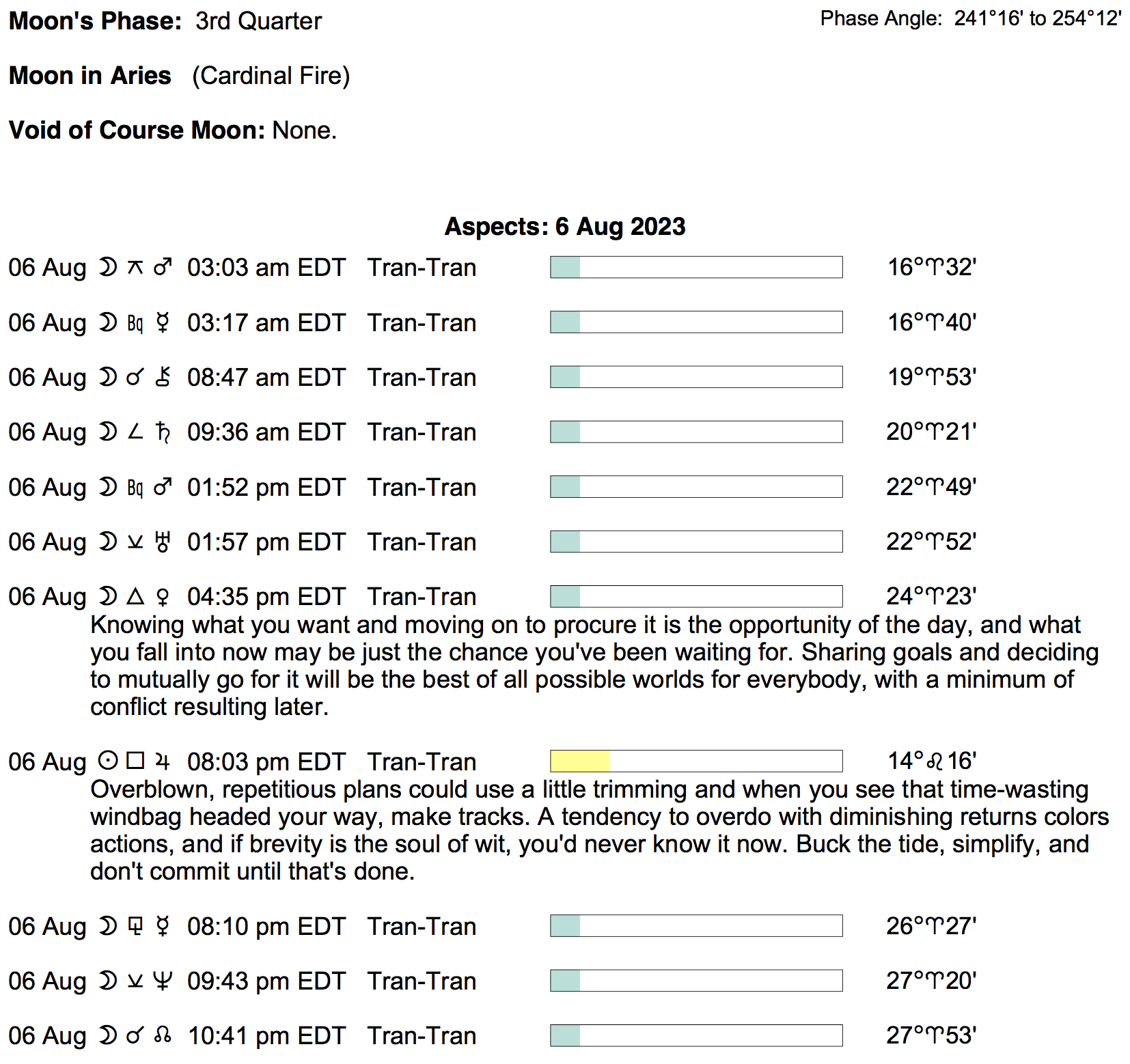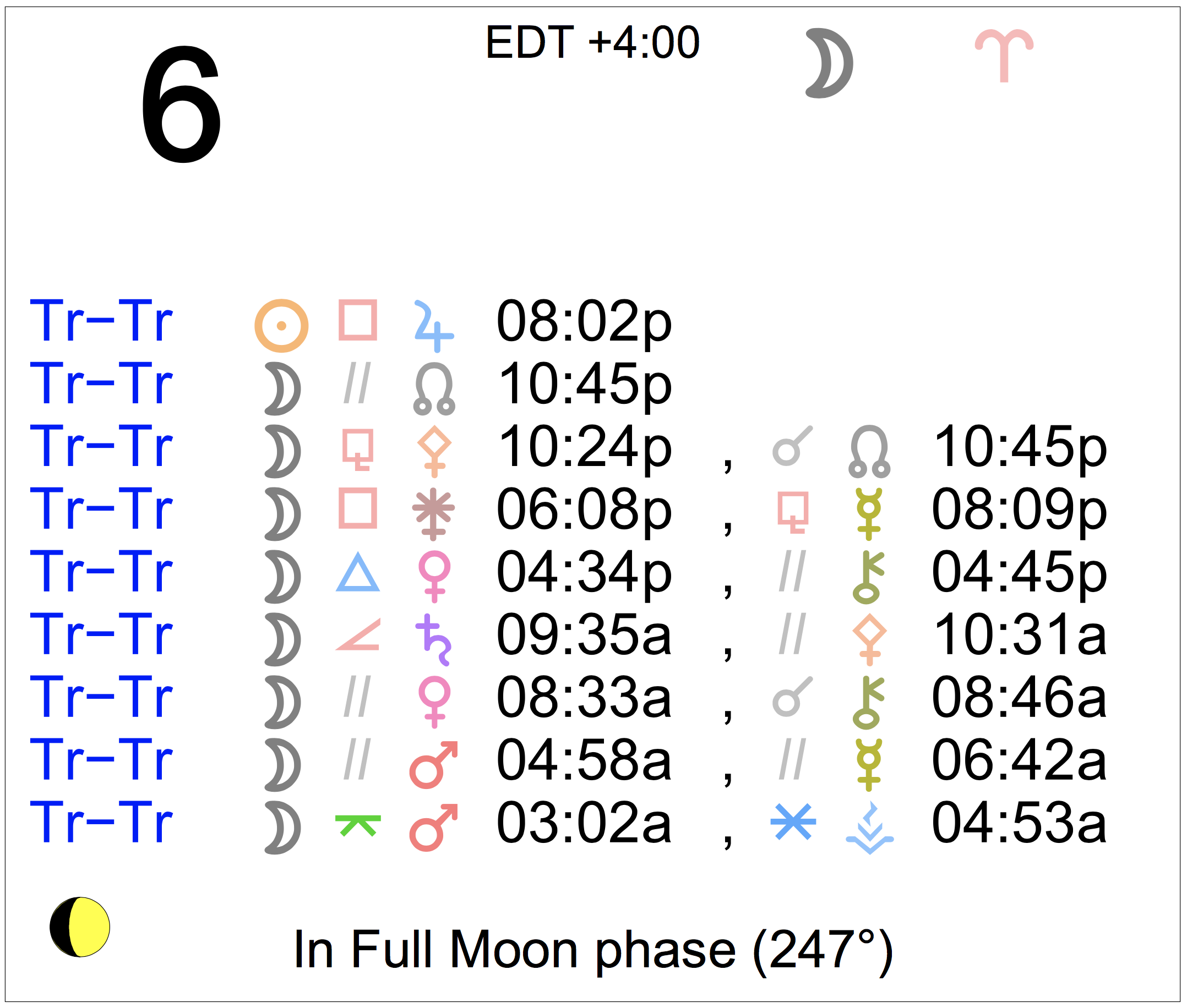 Planet Color Key: The longer the bar, the slower the aspecting planet, and the longer the duration of the planet’s transit.