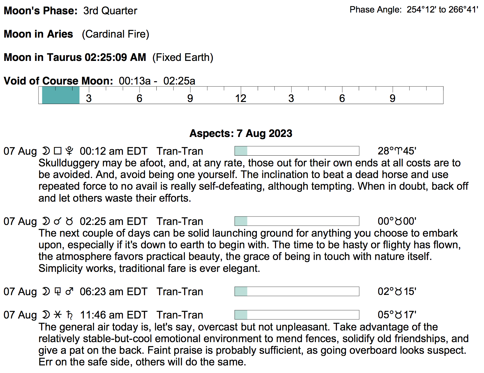 Planet Color Key: The longer the bar, the slower the aspecting planet, and the longer the duration of the planet’s transit.
