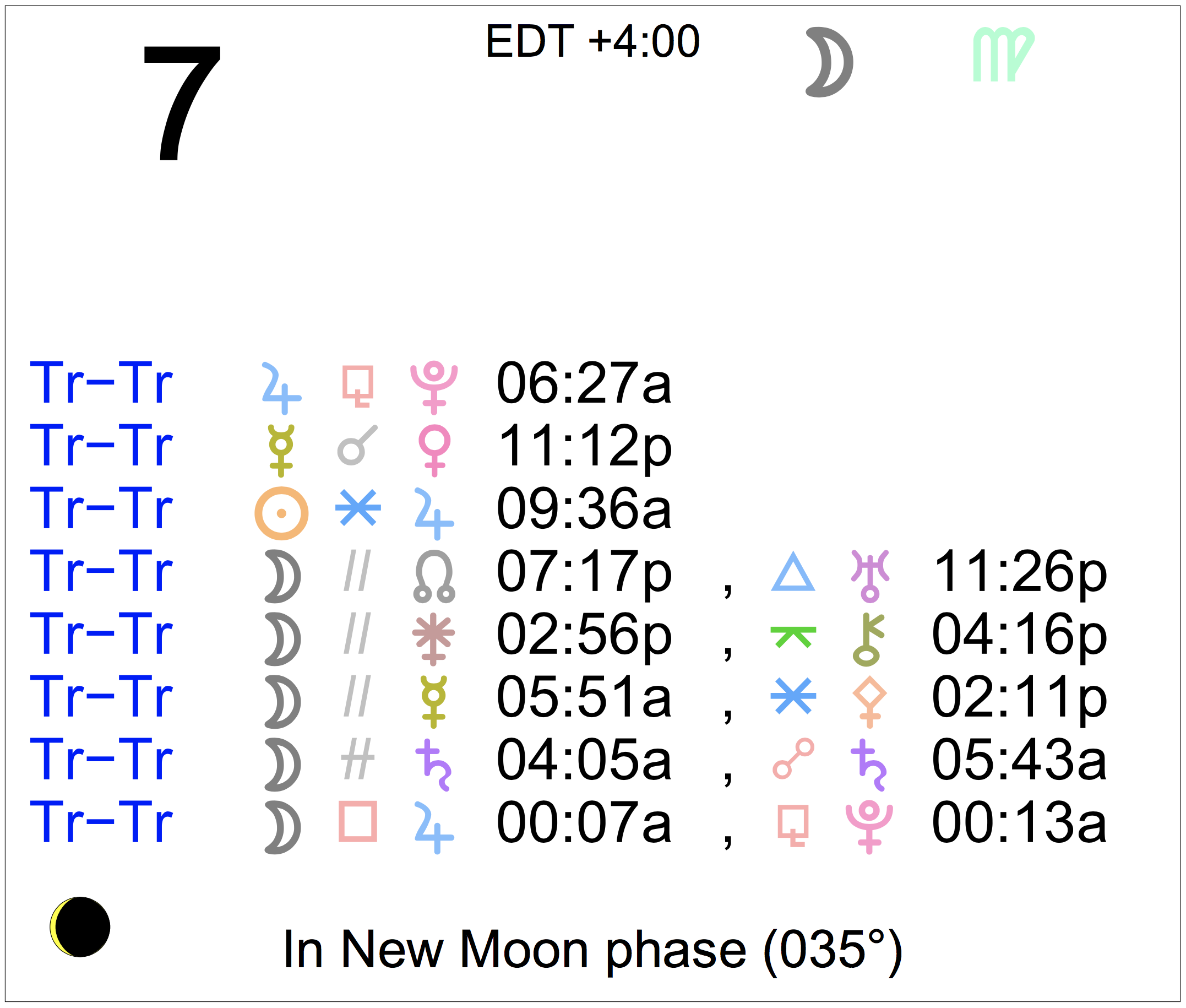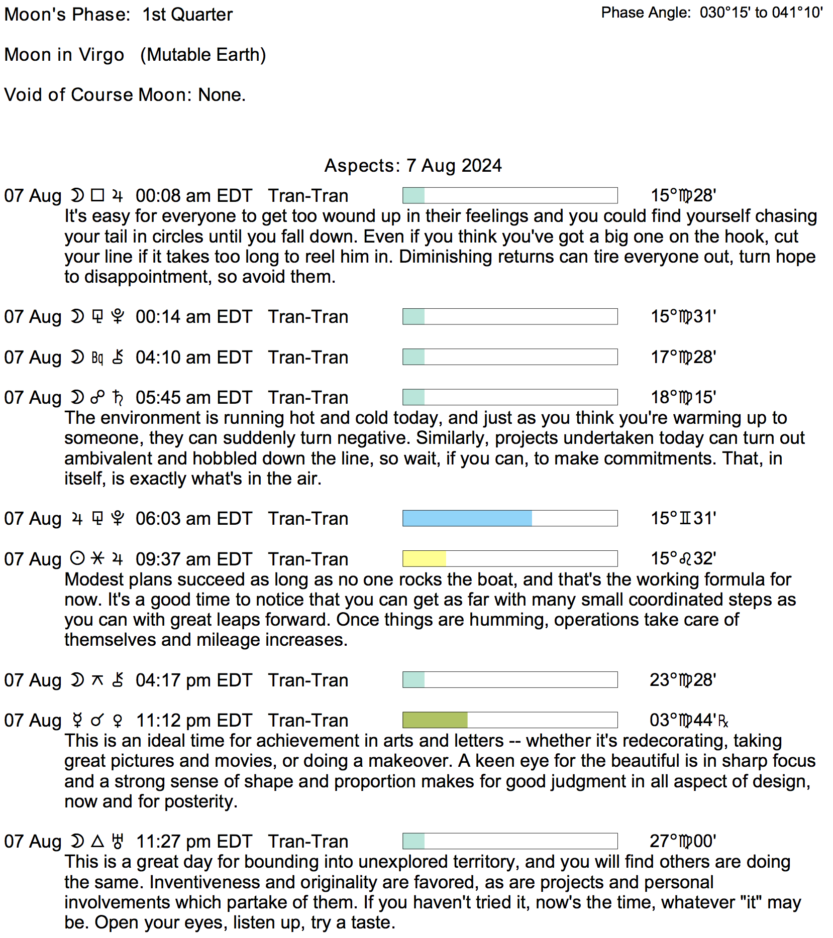 Planet Color Key: The longer the bar, the slower the aspecting planet, and the longer the duration of the planet’s transit.