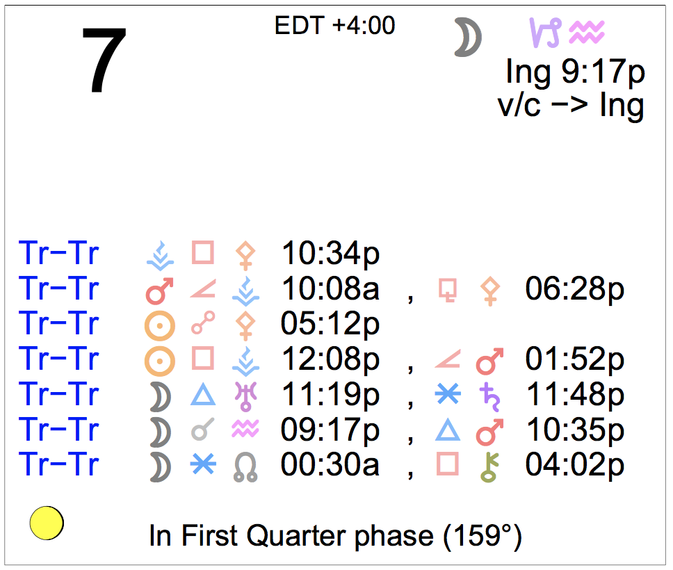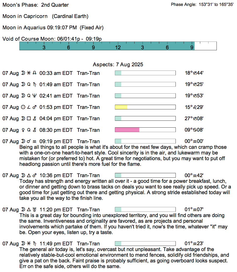 Planet Color Key: The longer the bar, the slower the aspecting planet, and the longer the duration of the planet’s transit.