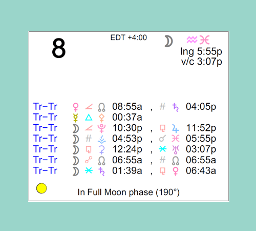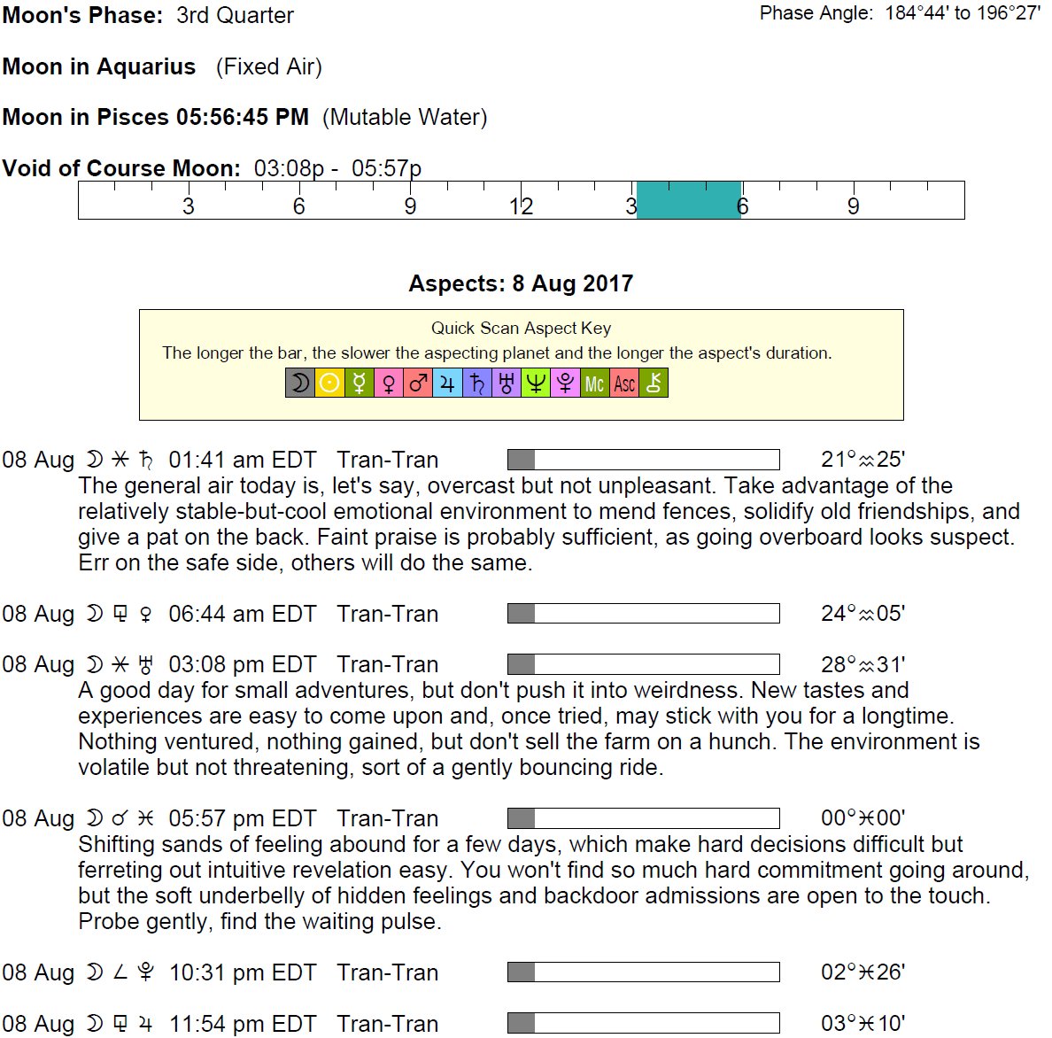 - The Full Moon (Lunar Eclipse) occurred yesterday in Aquarius, and the Last Quarter Moon will occur on August 14th.