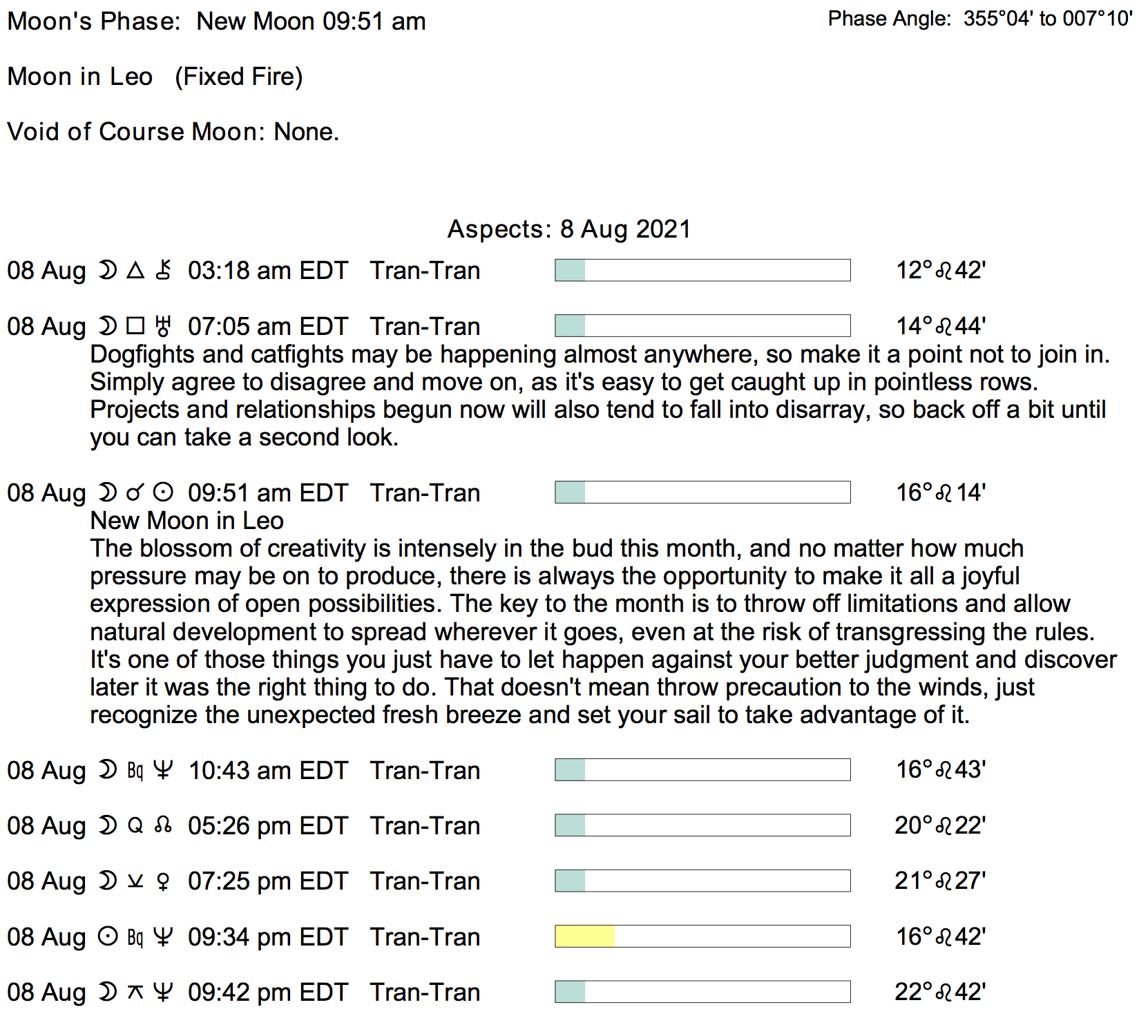 Planet Color Key: The longer the bar, the slower the aspecting planet, and the longer the duration of the planet’s transit.