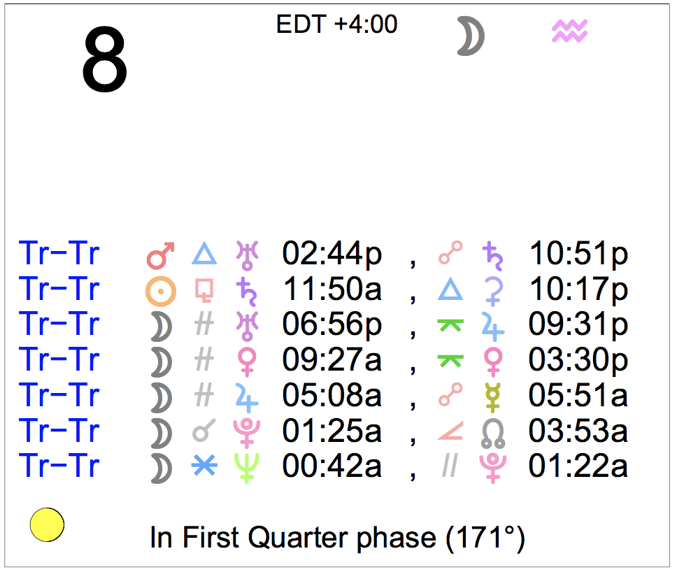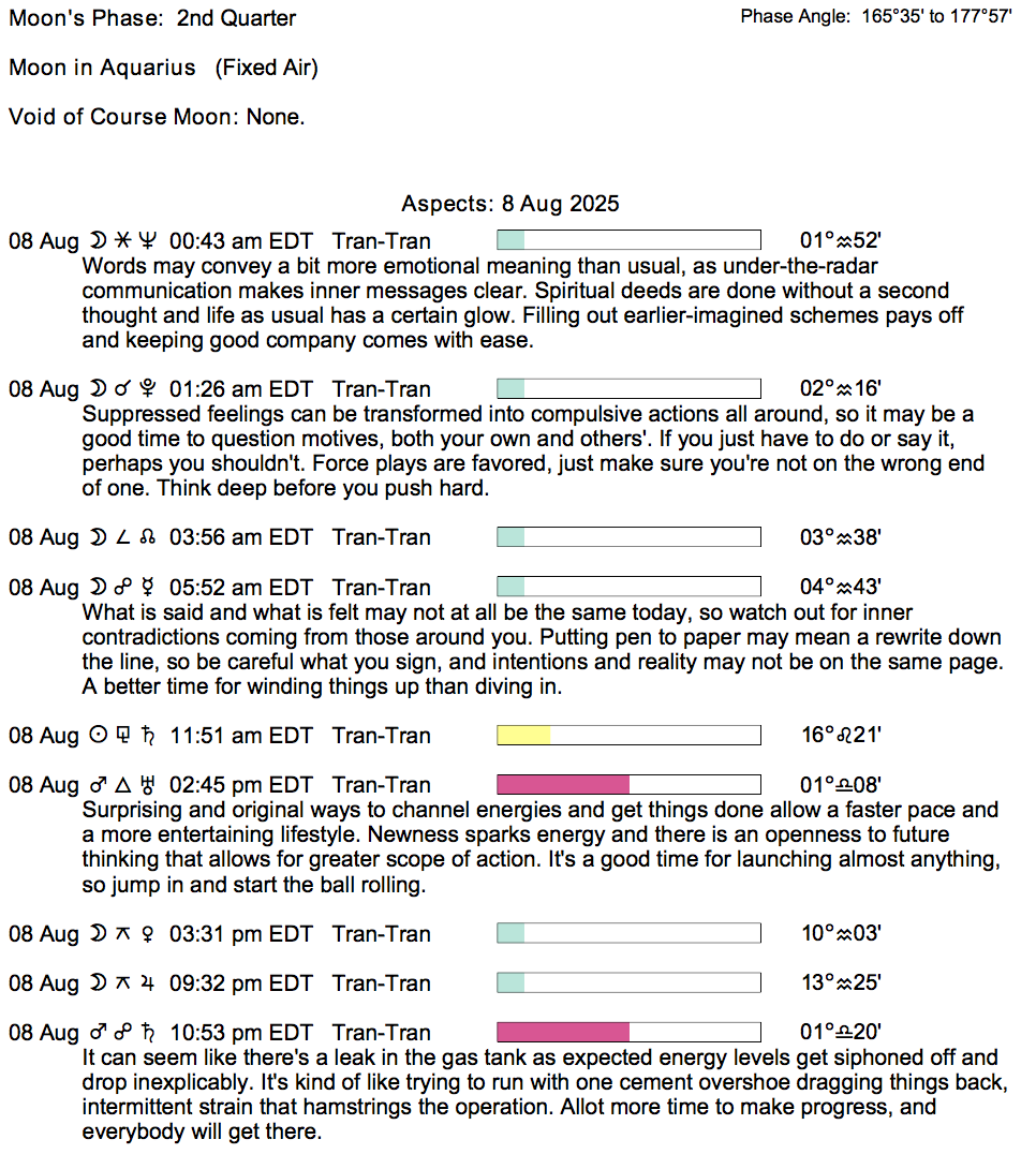 Planet Color Key: The longer the bar, the slower the aspecting planet, and the longer the duration of the planet’s transit.