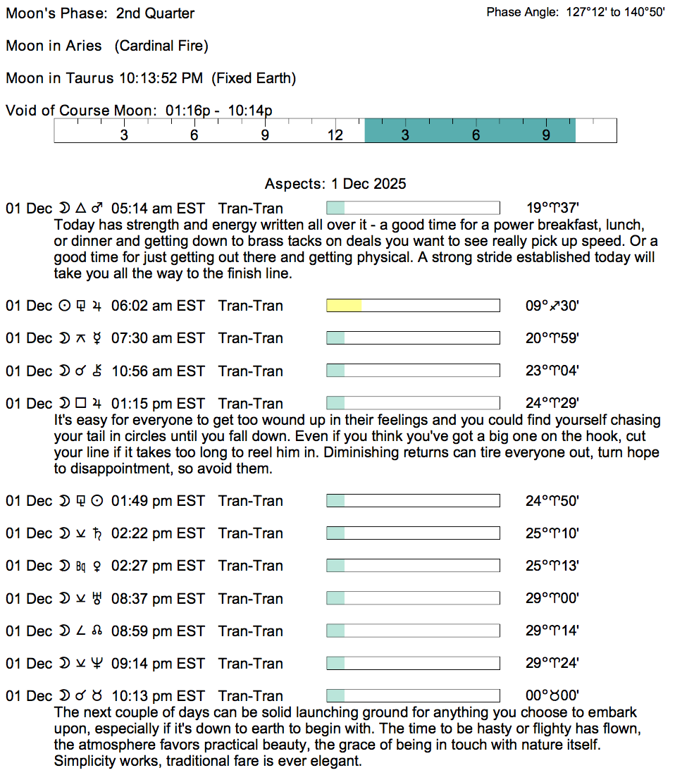 Planet Color Key: The longer the bar, the slower the aspecting planet, and the longer the duration of the planet’s transit.