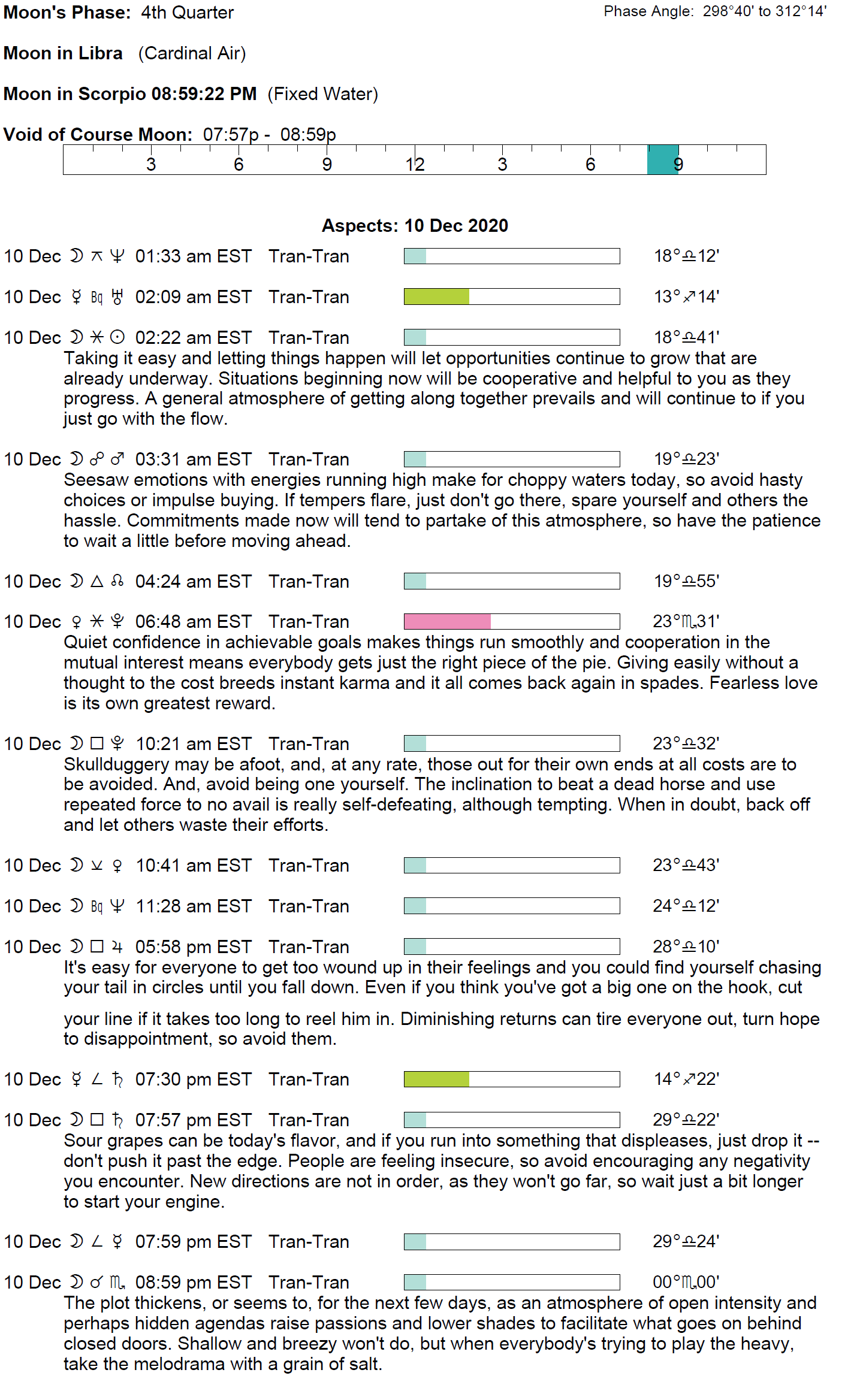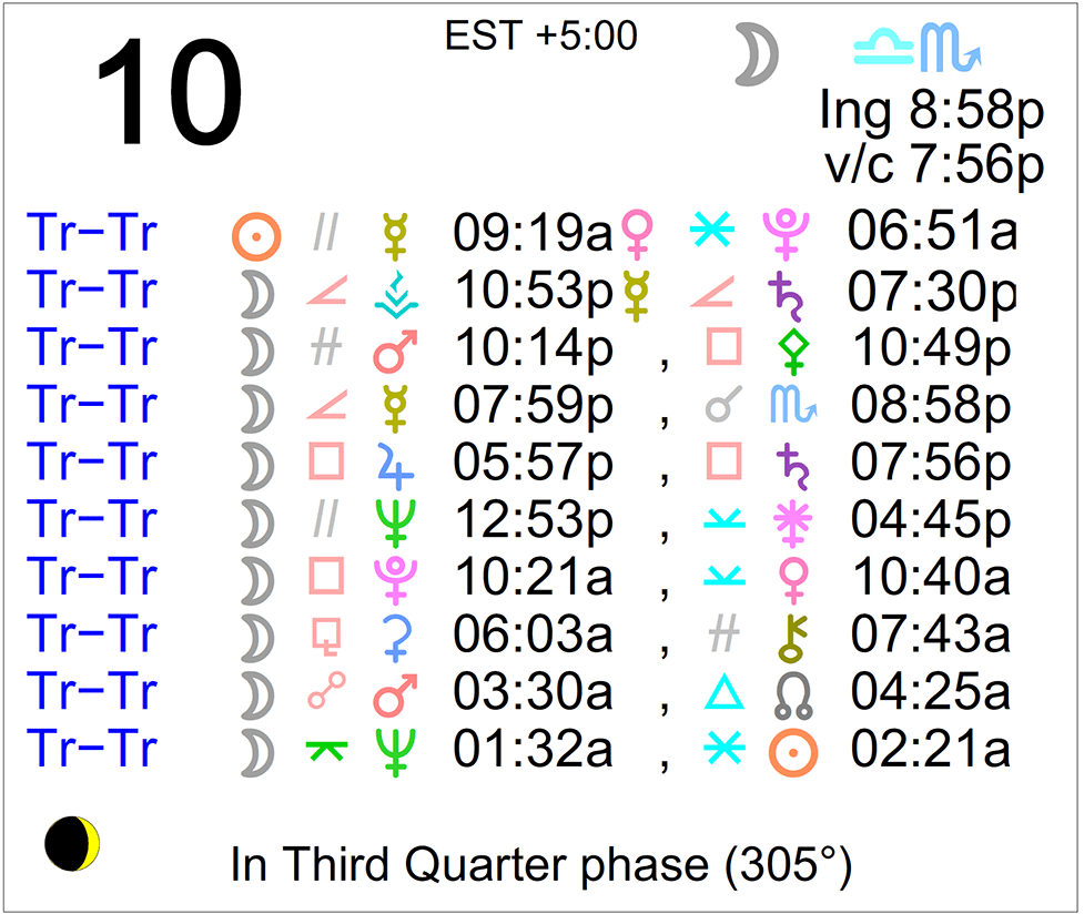 Planet Color Key: The longer the bar, the slower the aspecting planet, and the longer the duration of the planet’s transit.