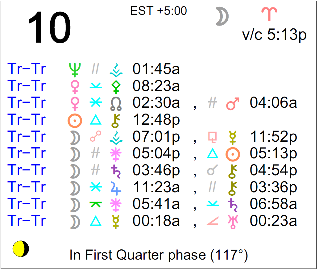 - A void Moon period occurs from 5:13 PM forward (until the Moon enters Taurus tomorrow at 10:54 AM).
