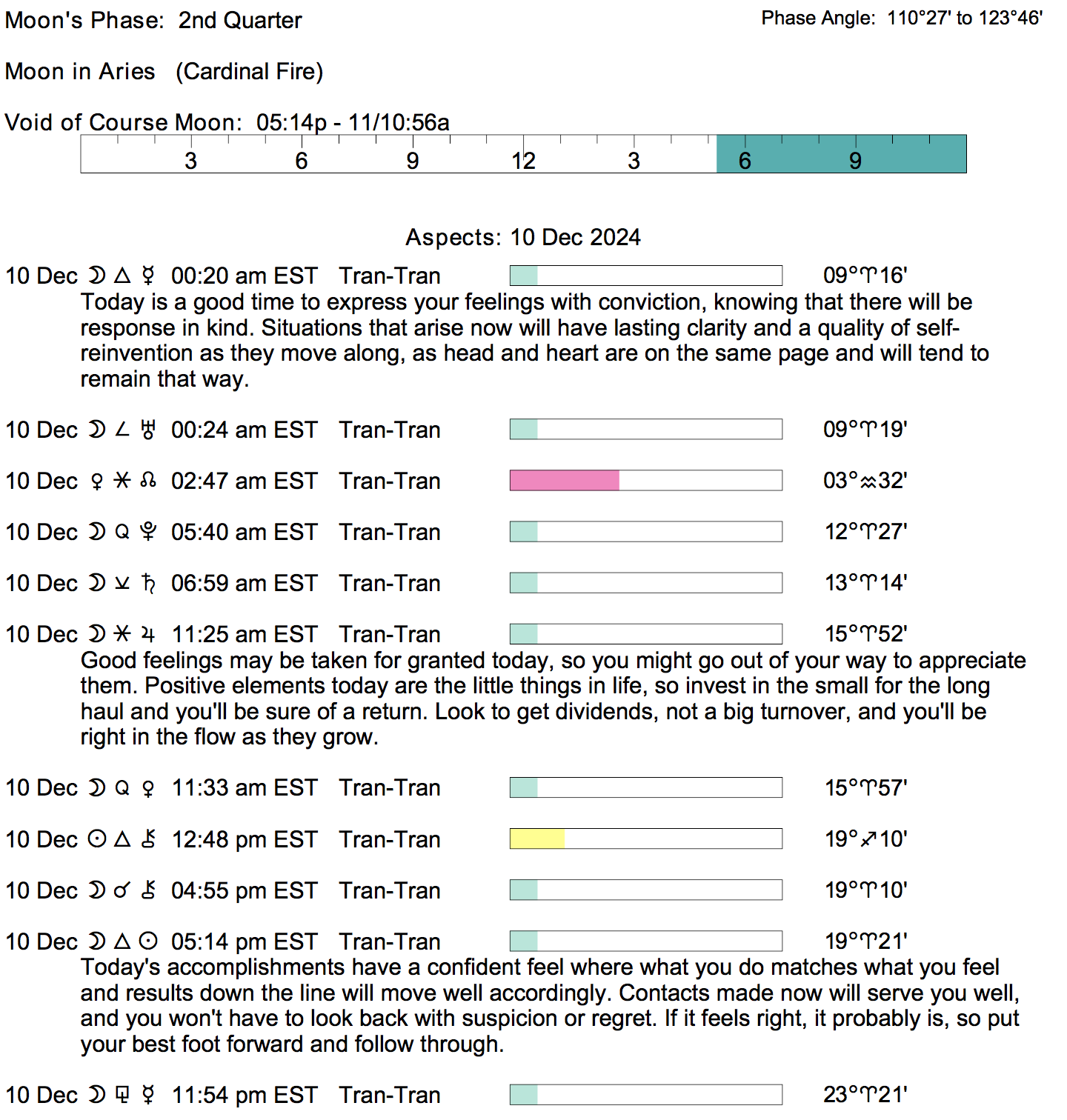 Planet Color Key: The longer the bar, the slower the aspecting planet, and the longer the duration of the planet’s transit.
