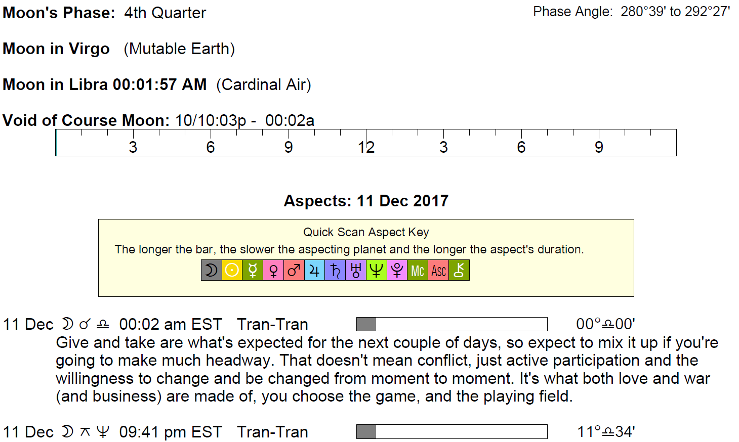 The following aspects (major only) and positions are at noon (EST) on December 11th: