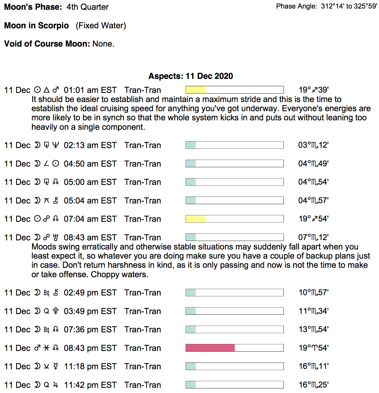 Planet Color Key: The longer the bar, the slower the aspecting planet, and the longer the duration of the planet’s transit.