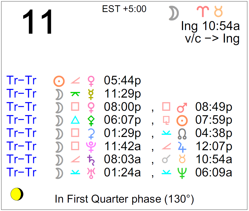 - The Moon is in Aries until 10:54 AM, from which time the Moon is in Taurus.