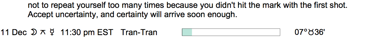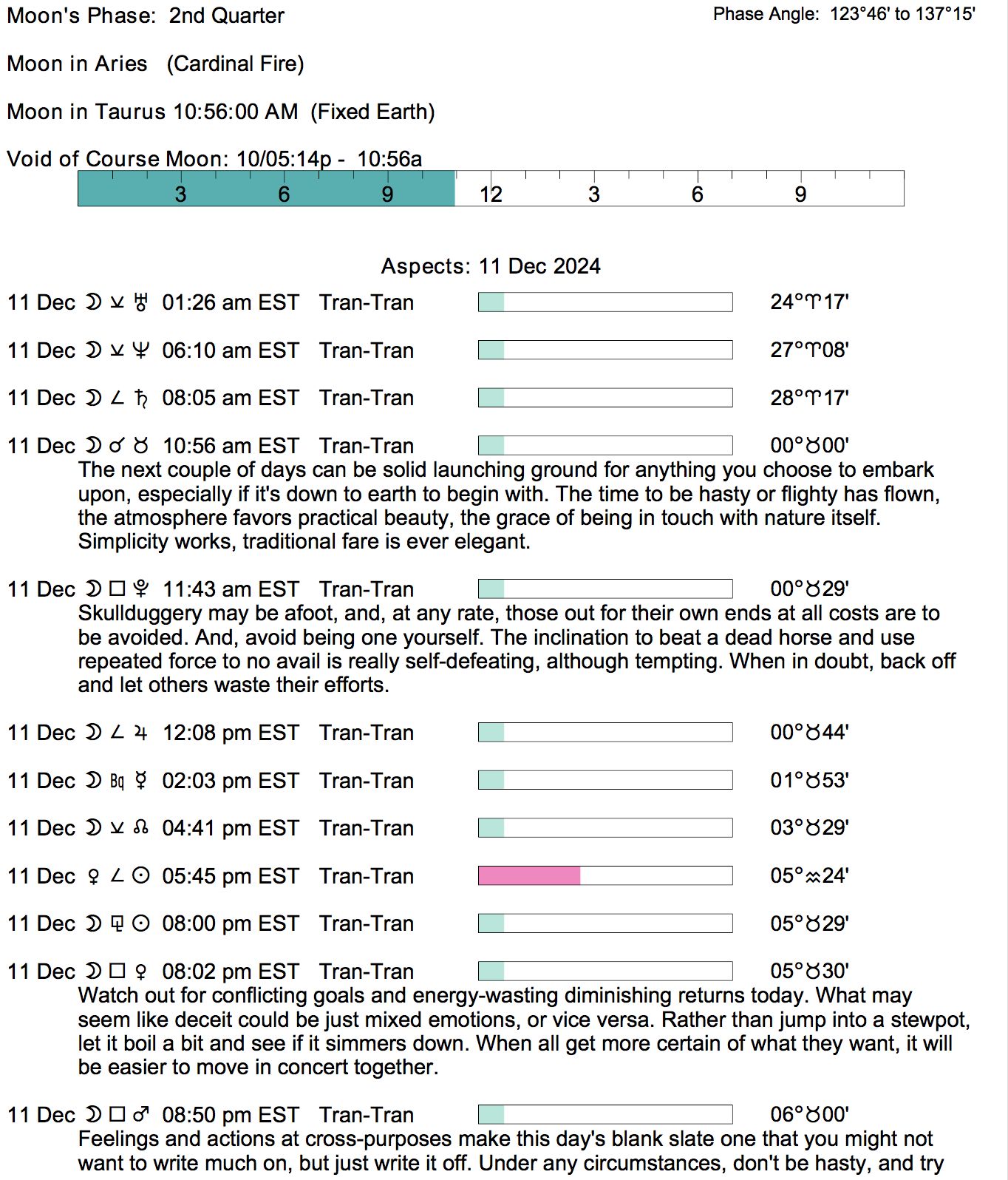 Planet Color Key: The longer the bar, the slower the aspecting planet, and the longer the duration of the planet’s transit.