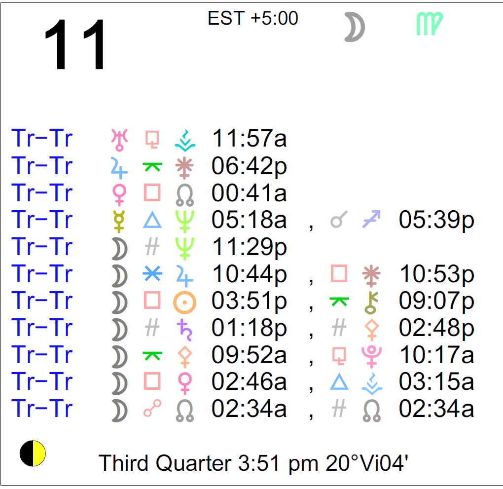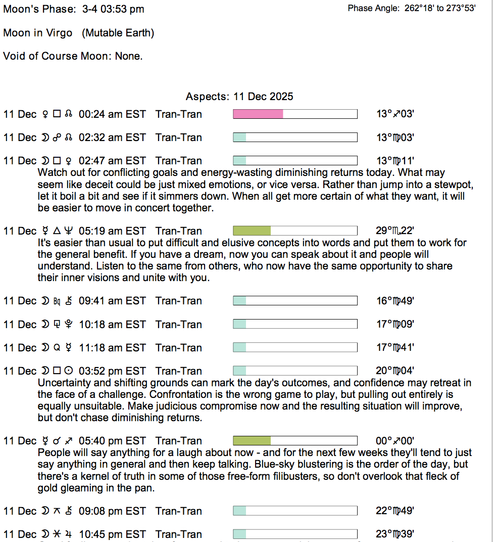 Planet Color Key: The longer the bar, the slower the aspecting planet, and the longer the duration of the planet’s transit.