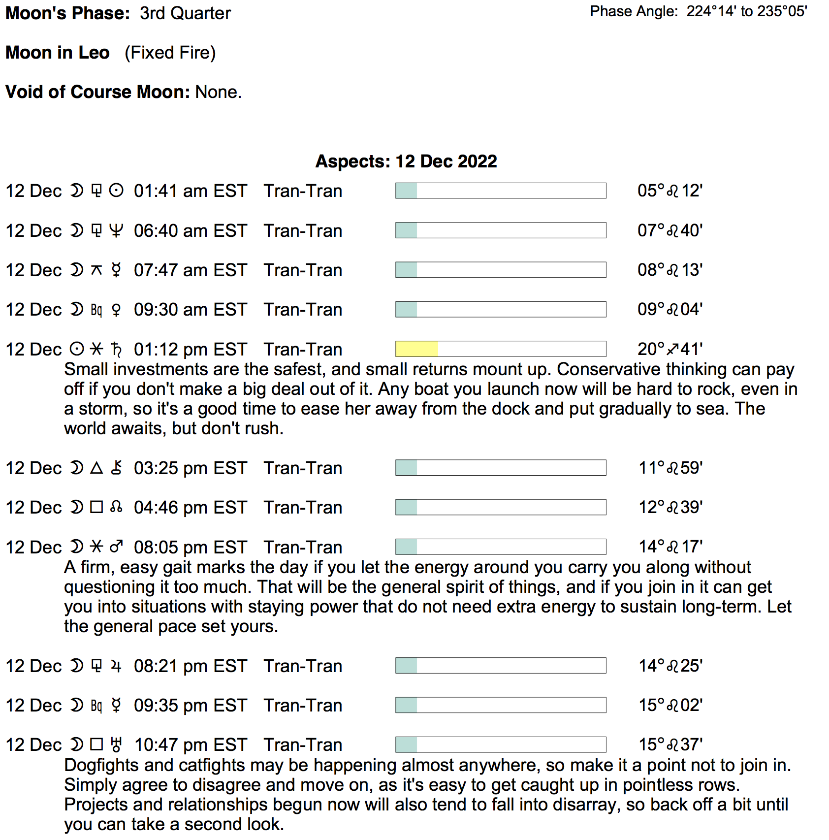 Planet Color Key: The longer the bar, the slower the aspecting planet, and the longer the duration of the planet’s transit.