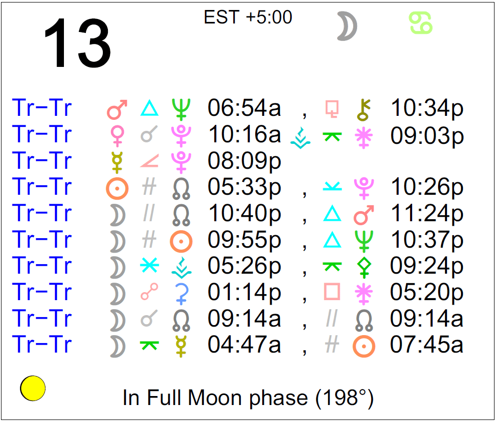 Planet Color Key: The longer the bar, the slower the aspecting planet and the longer the duration of the planet’s transit.