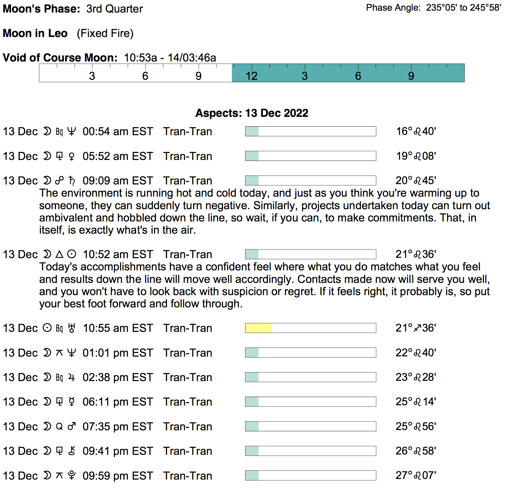 Planet Color Key: The longer the bar, the slower the aspecting planet, and the longer the duration of the planet’s transit.