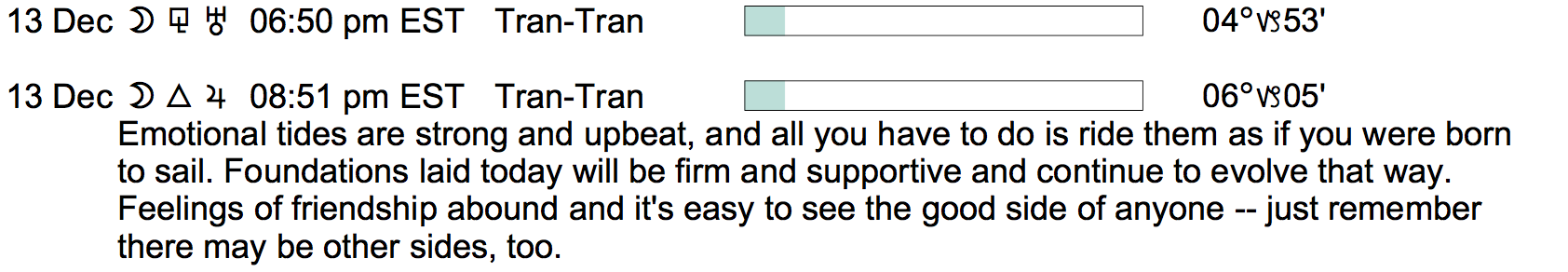 Planet Color Key: The longer the bar, the slower the aspecting planet, and the longer the duration of the planet’s transit.