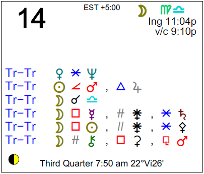 An auspicious time for any project demanding endurance or tolerance. Also good for establishing new habits and rituals.