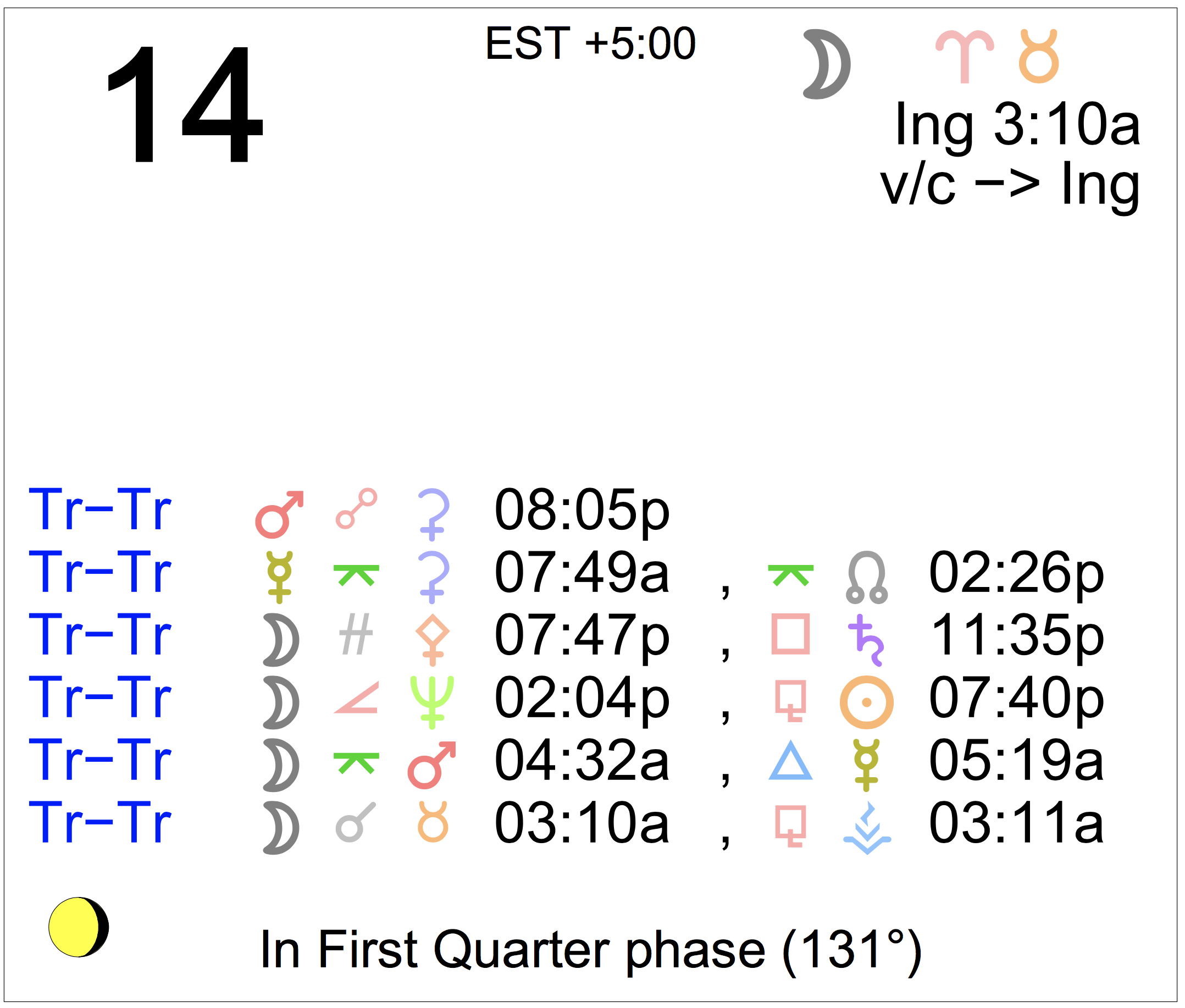Planet Color Key: The longer the bar, the slower the aspecting planet, and the longer the duration of the planet’s transit.