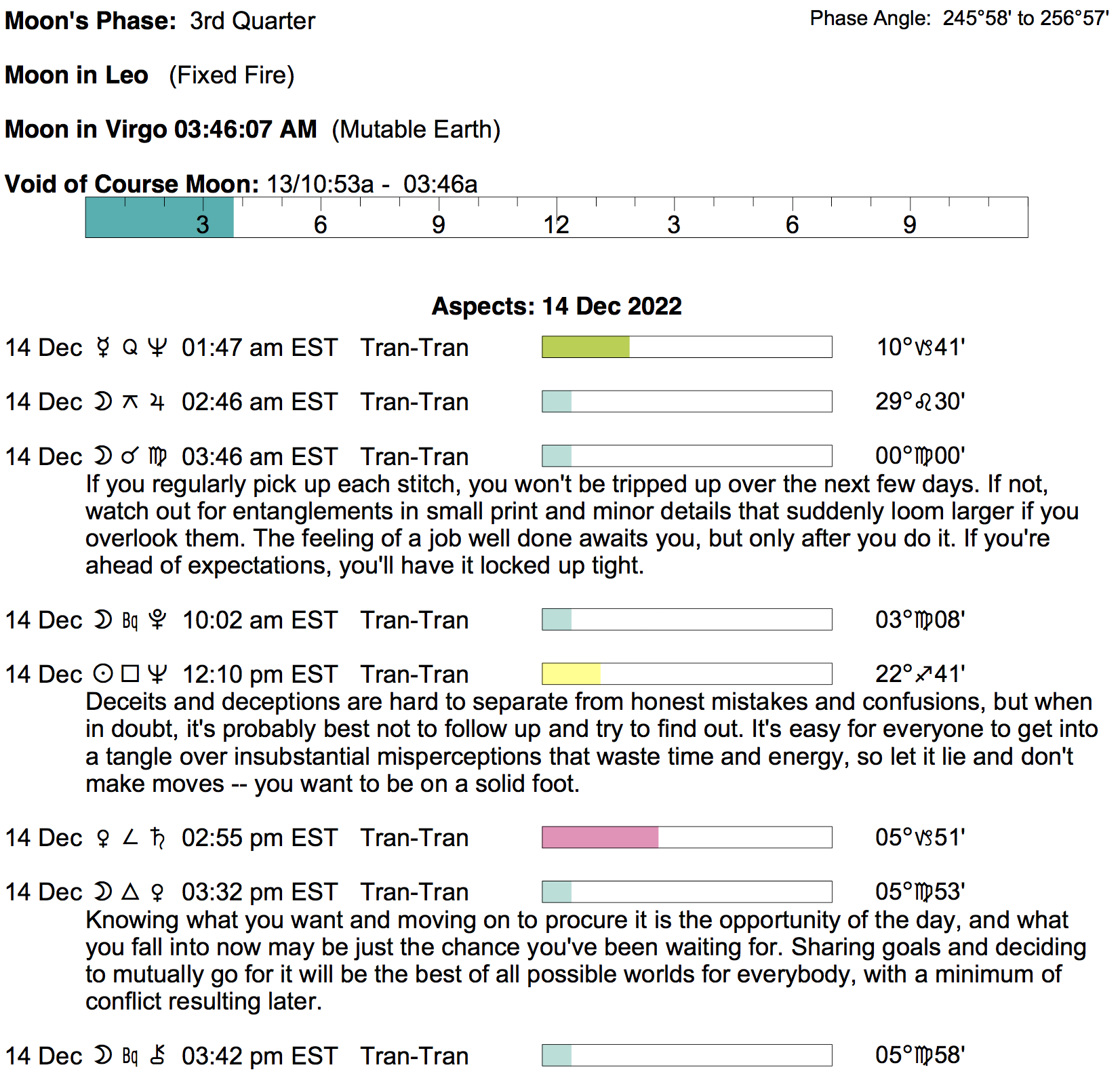 Planet Color Key: The longer the bar, the slower the aspecting planet, and the longer the duration of the planet’s transit.
