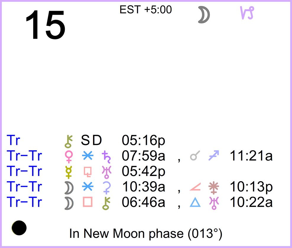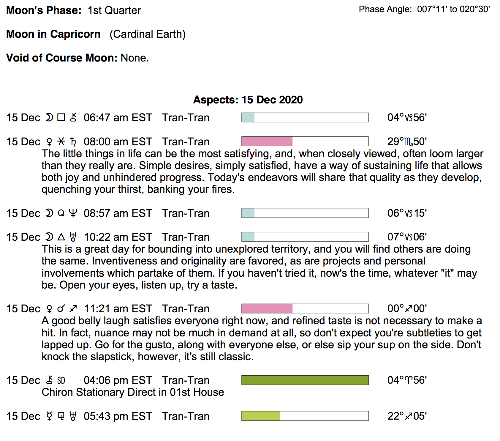 Planet Color Key: The longer the bar, the slower the aspecting planet, and the longer the duration of the planet’s transit.