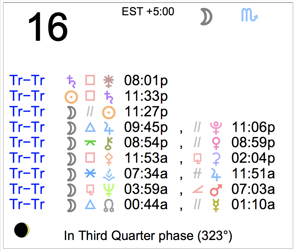 Planet Color Key: The longer the bar, the slower the aspecting planet, and the longer the duration of the planet’s transit.