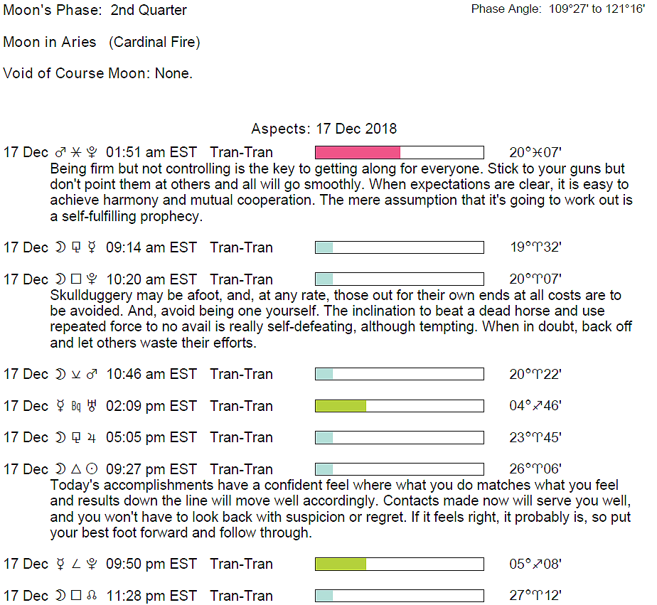 Planet Color Key: The longer the bar, the slower the aspecting planet and the longer the duration of the planet’s transit.